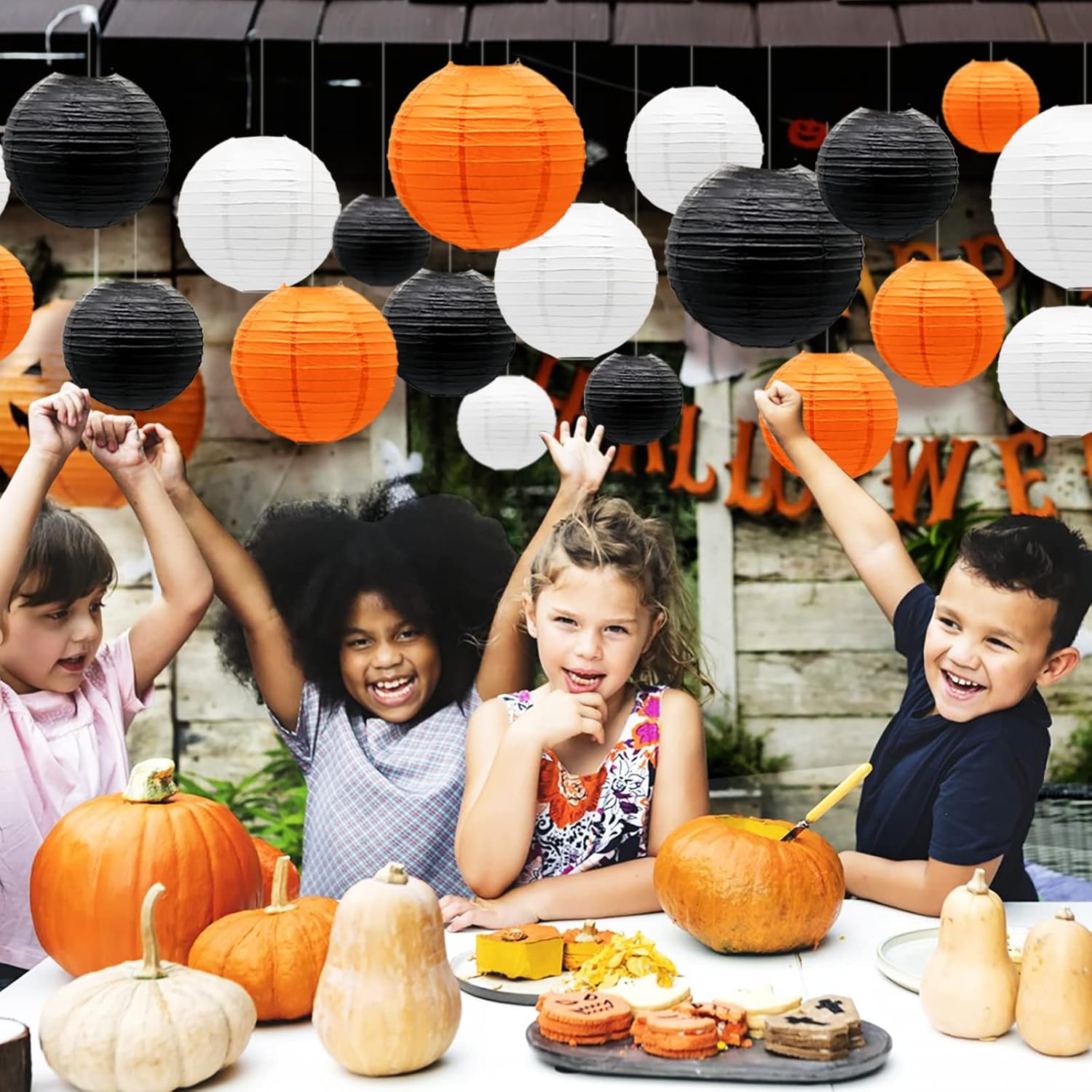 • ORANGE WHITE BALCK THEME PARTY DECOR - Paper lanterns are suitable for children's DIY activities, Halloween birthday party, Graduation party, also suitable for events such as wedding party decoration, birthday party for adults, Thanksgiving party, friendsgiving decorations, fall party, and office halloween party , outdoor BBQ, classroom, celebrations, market decoration summer garden party and other theme parties. You can mix and match the lanterns as you like
