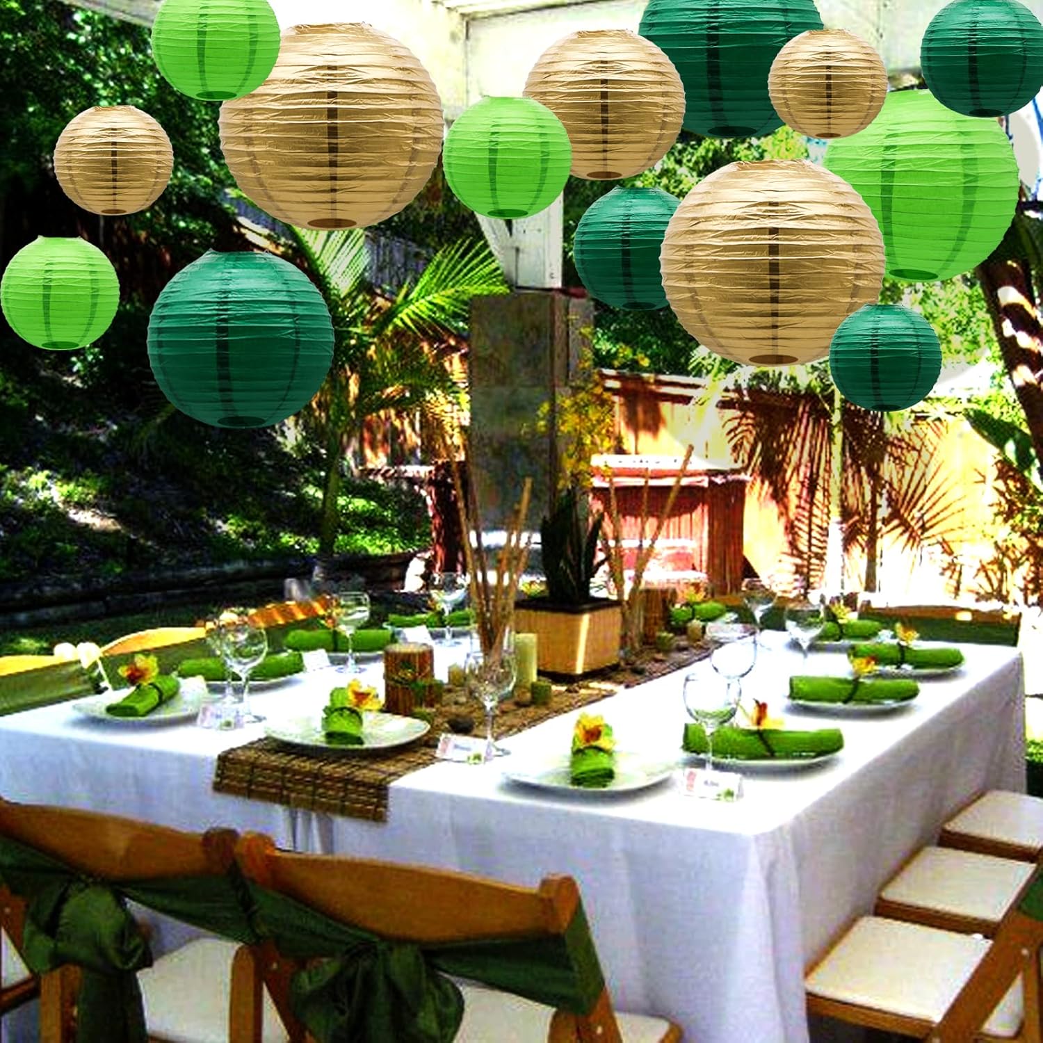 • PAPER LANTERNS SETS CONTENT - 3 Assorted light green, green, gold paper lantern value combination pack of 21 pieces assorted size ranging from Small to X-Large. You will receive 6 pcs of 4 Inch Lanterns, 6 pcs of 6 Inch Lanterns, 6 pcs of 8 Inch Lanterns, 3 pcs of 10 Inch Lanterns. These Chinese lanterns can be matched with many scenes and themed party decorations to create a distinctive party decoration and make the party more unique