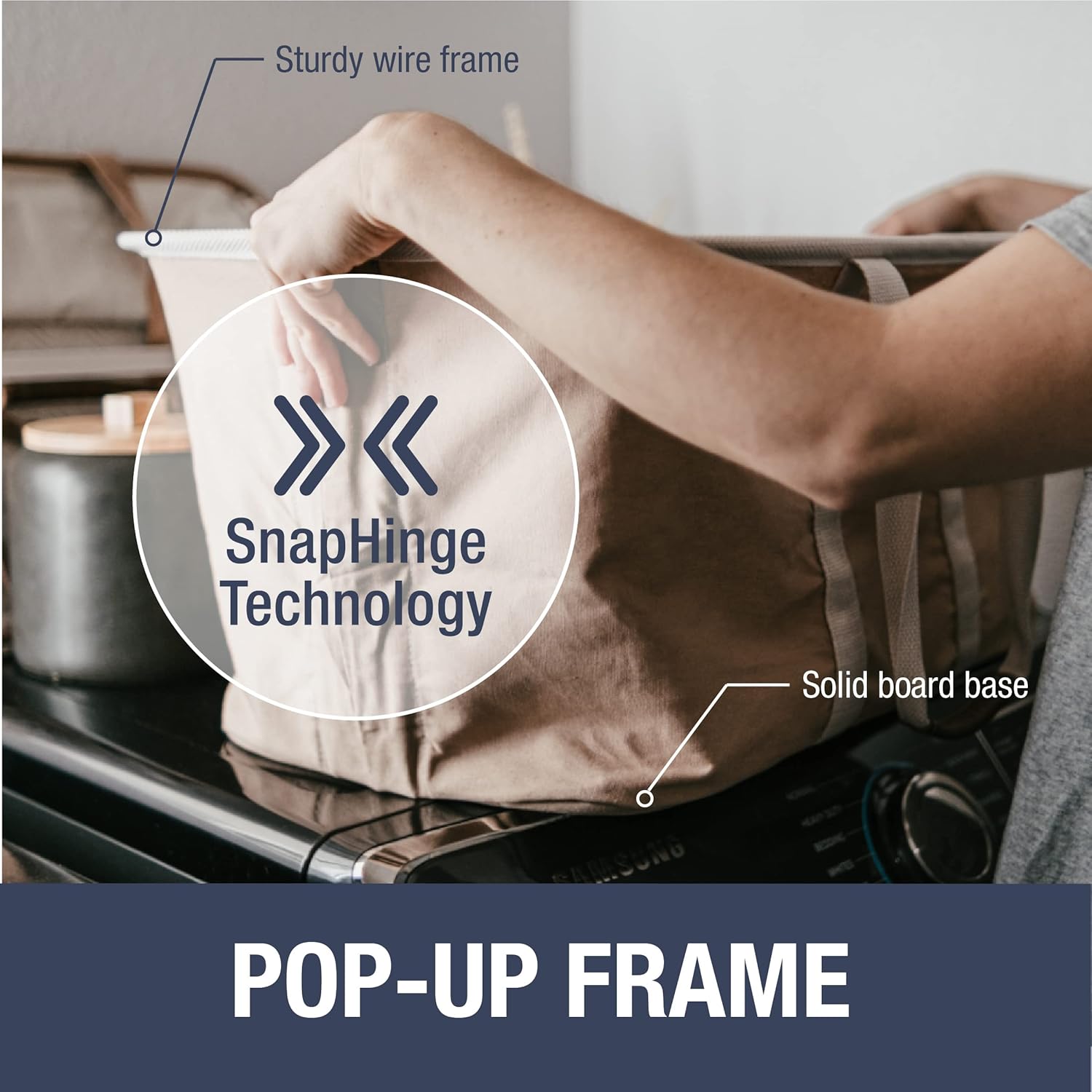 • Reinforced Steel Rim and Wooden Base: Engineered with SnapHinge technology, this fabric laundry basket features a solid board base and a durable rim for a lightweight and sturdy structure that snaps open for use or folds flat for storage