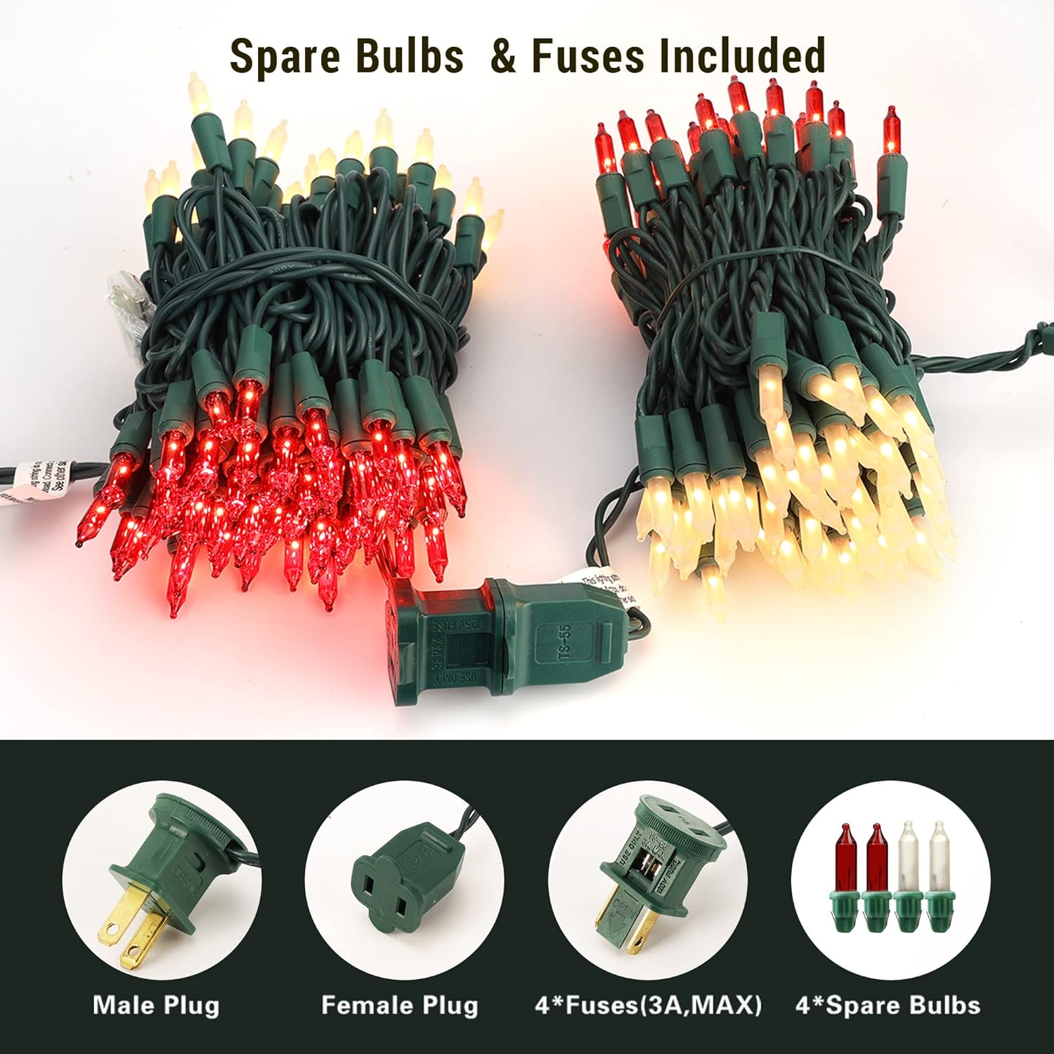 • Incandescent Red & White Christmas Lights: 150 count per string with bulb space 2.76in, 2.5V and 0.43W per bulbs, built-in 3A fuse for safety use. Extra bulbs and fuses included.