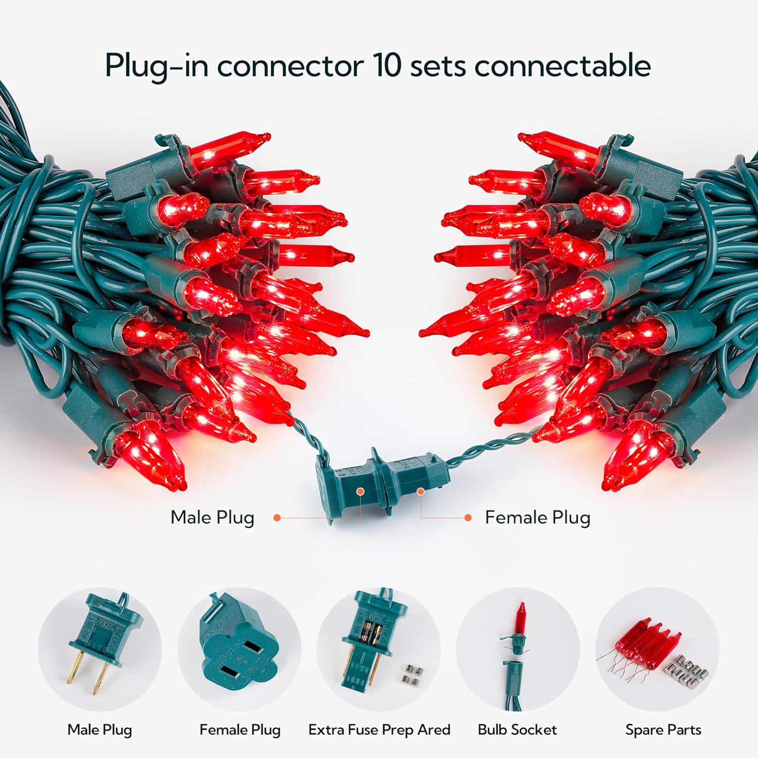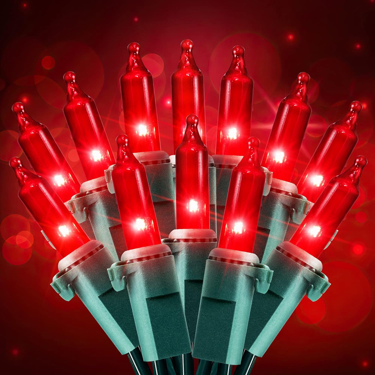 • 💕2Pack Incandescent Christmas Lights:Hopolon 2 PACK 50L Red Christmas mini lights is 13ft in total-Green wire with Bulbs: 3.5m/11.5ft, cord without lights50cm/1.5ft, spacing between every bulb: 7cm/2.76in. With Thicker green wire with strong insulated copper core, tangle-free to use,High quality UL certified products ensure the safety of you and your family.