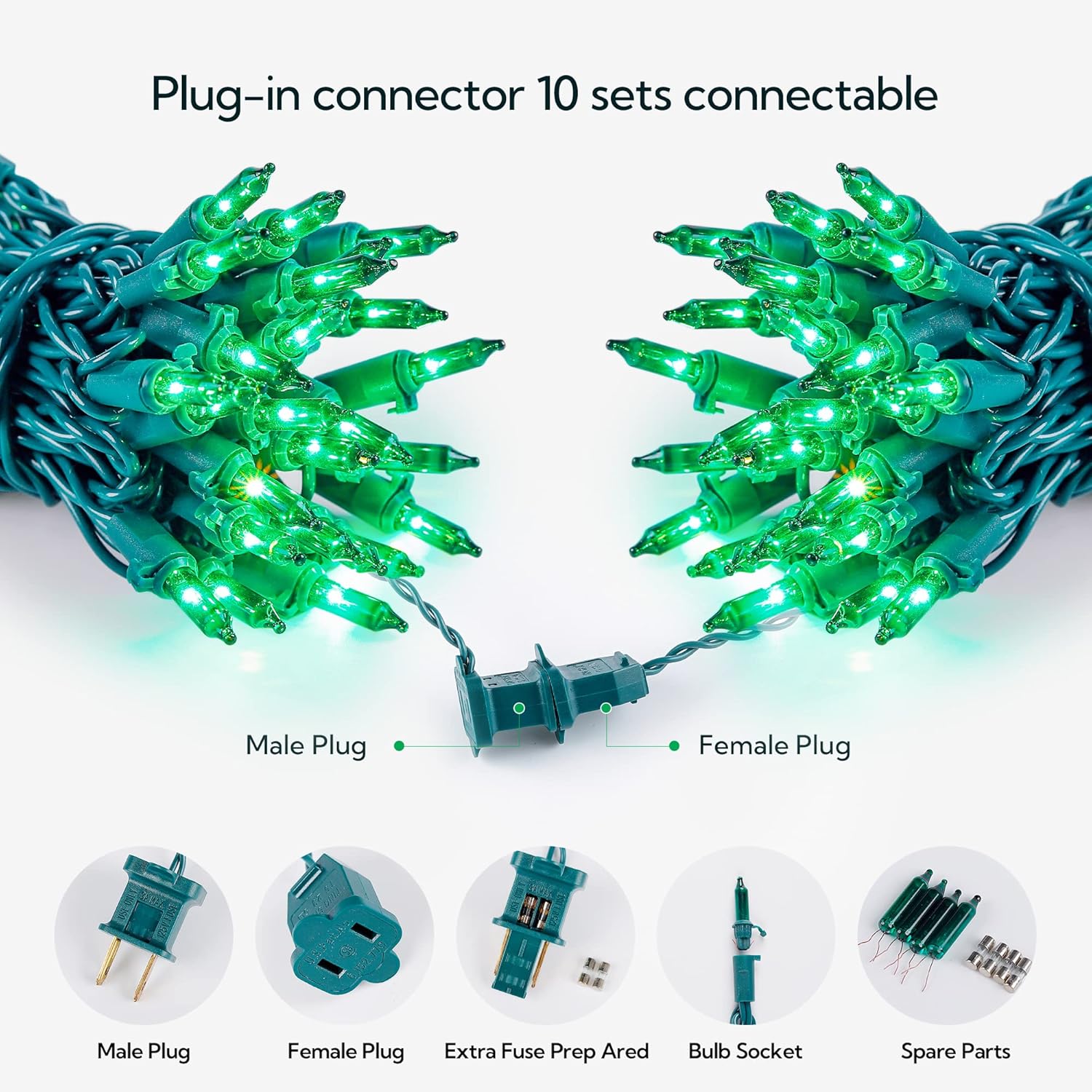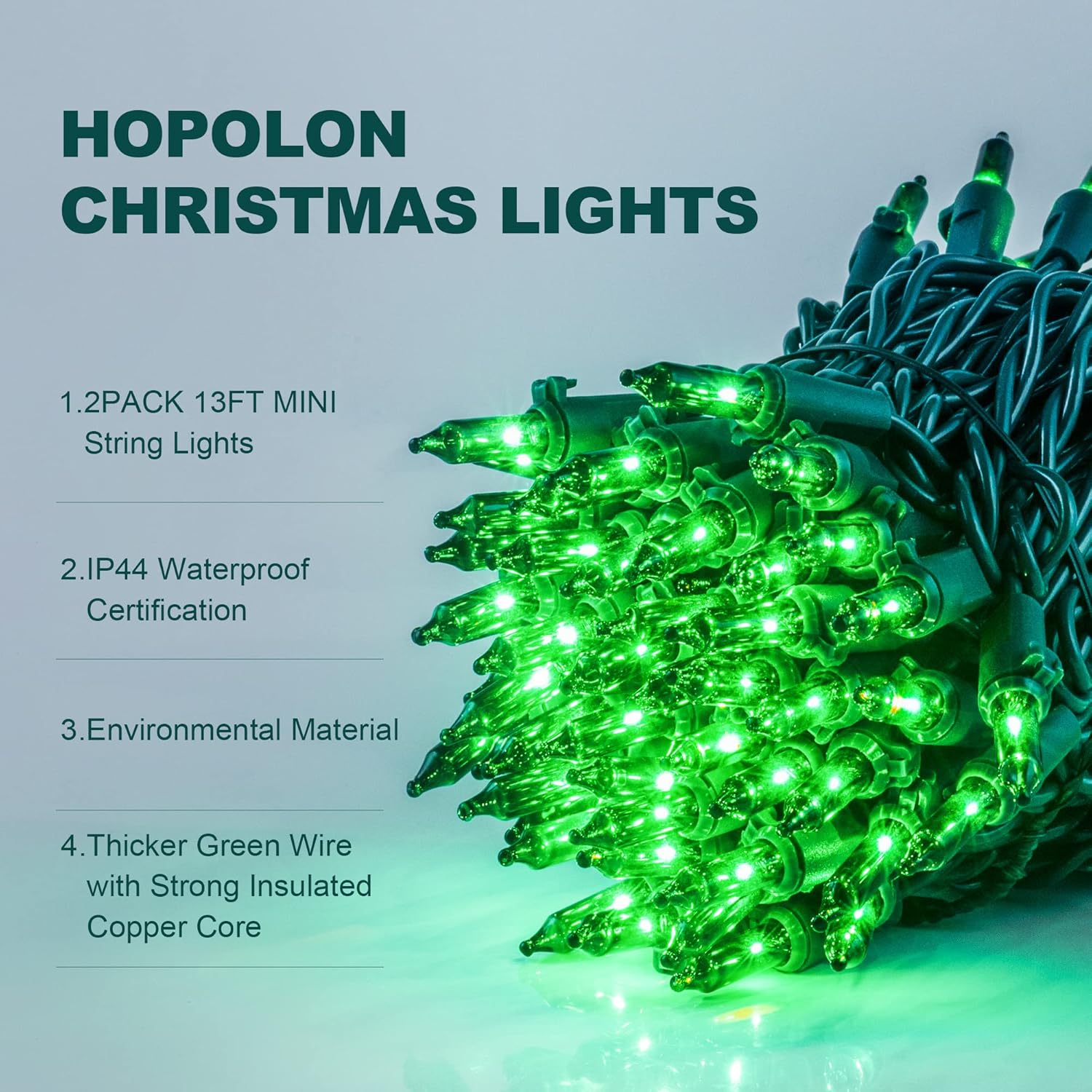 • 🍀2Pack Incandescent Christmas Lights:Hopolon 2 PACK 50L Green Christmas mini lights is 13ft in total-Green wire with Bulbs: 3.5m/11.5ft, cord without lights50cm/1.5ft, spacing between every bulb: 7cm/2.76in. With Thicker green wire with strong insulated copper core, tangle-free to use,High quality UL certified products ensure the safety of you and your family.