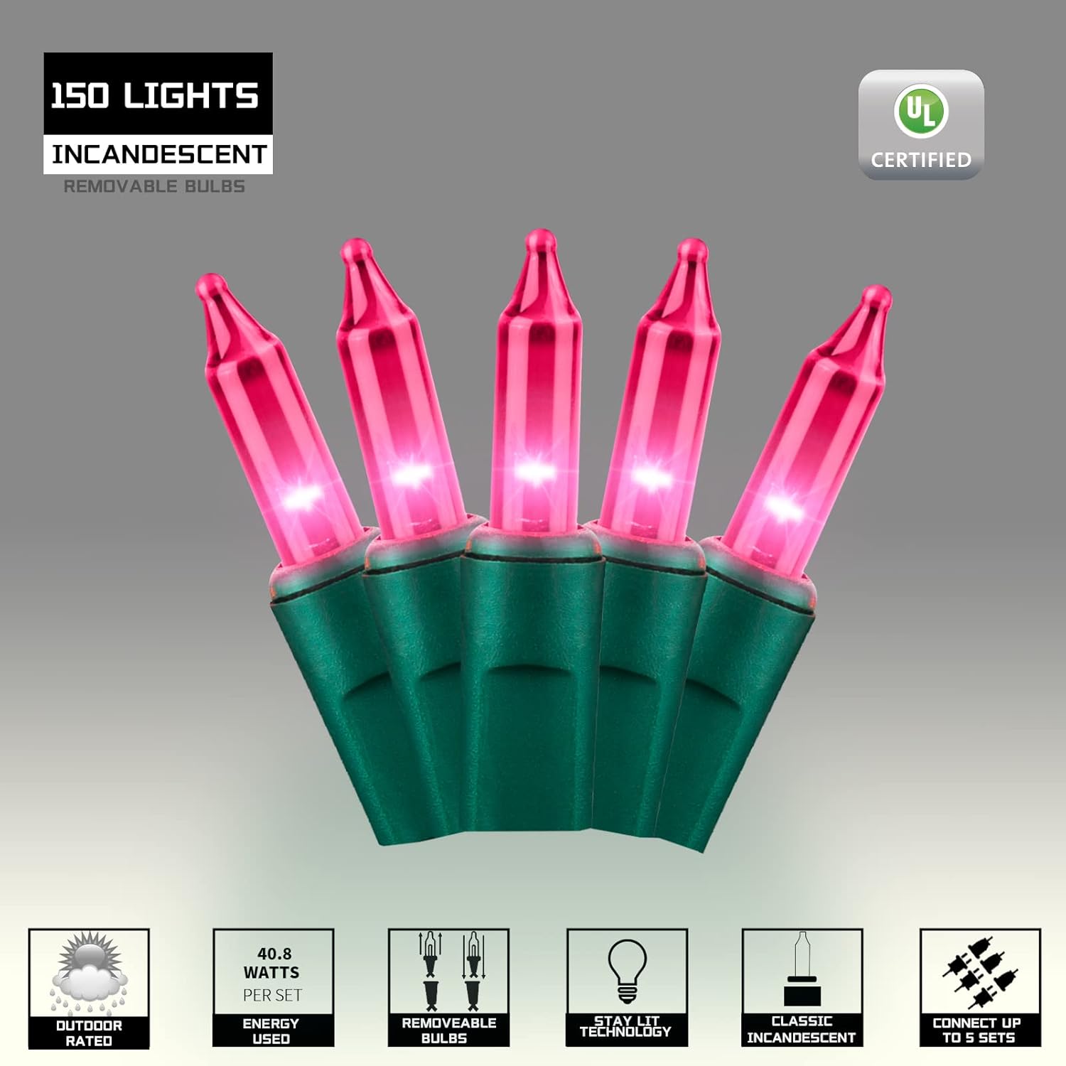 • Safty and Easily: High quality UL certified products ensure the safety of you and your family, Decorate with 150 pink incandescent mini lights with green wire will give a soft festive feel to your Christmas.