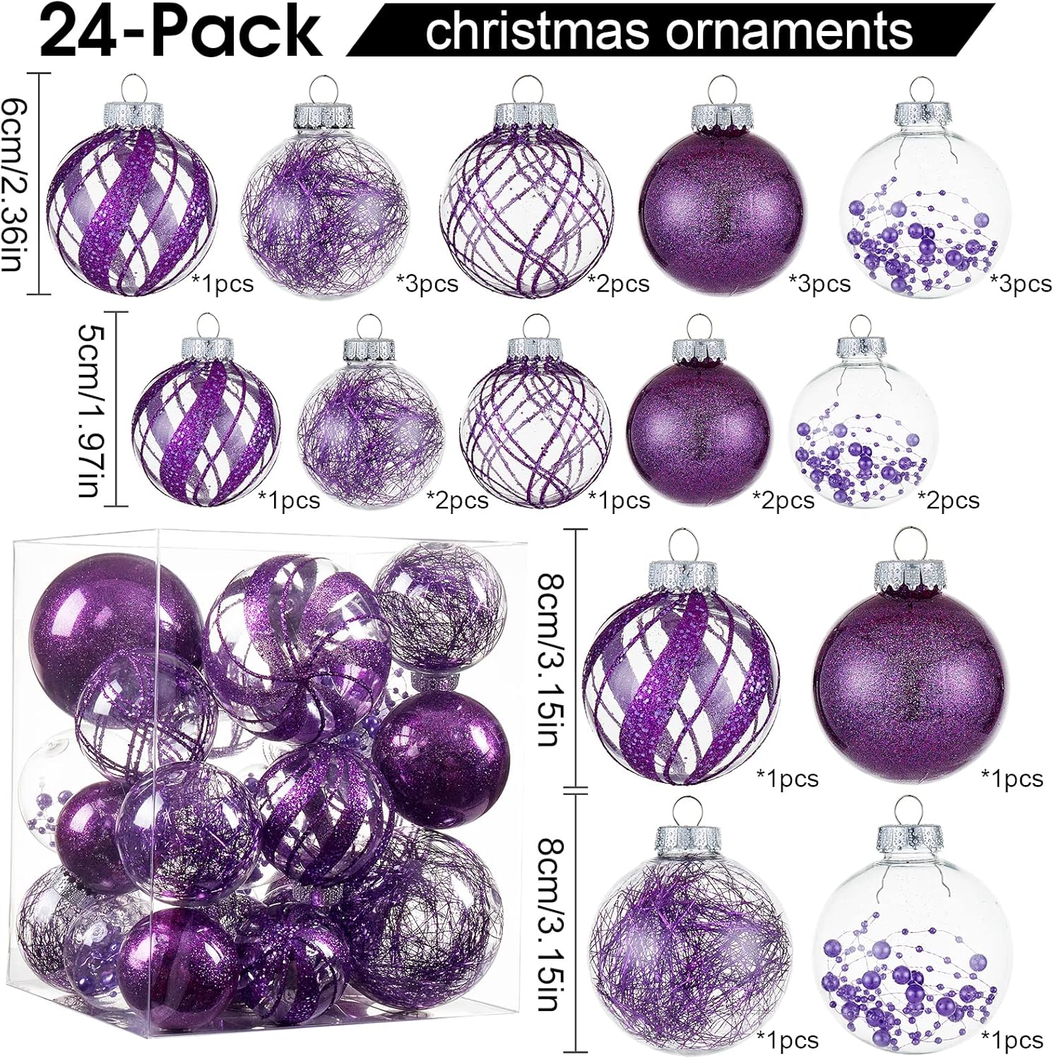 Clear Christmas Ball Ornaments,24ct Shatterproof Plastic Decorative Christmas Ornaments Hanging Xmas Tree Baubles Set with Stuffed Delicate Glittering Decorations for Holiday Party Home Decor(Purple)