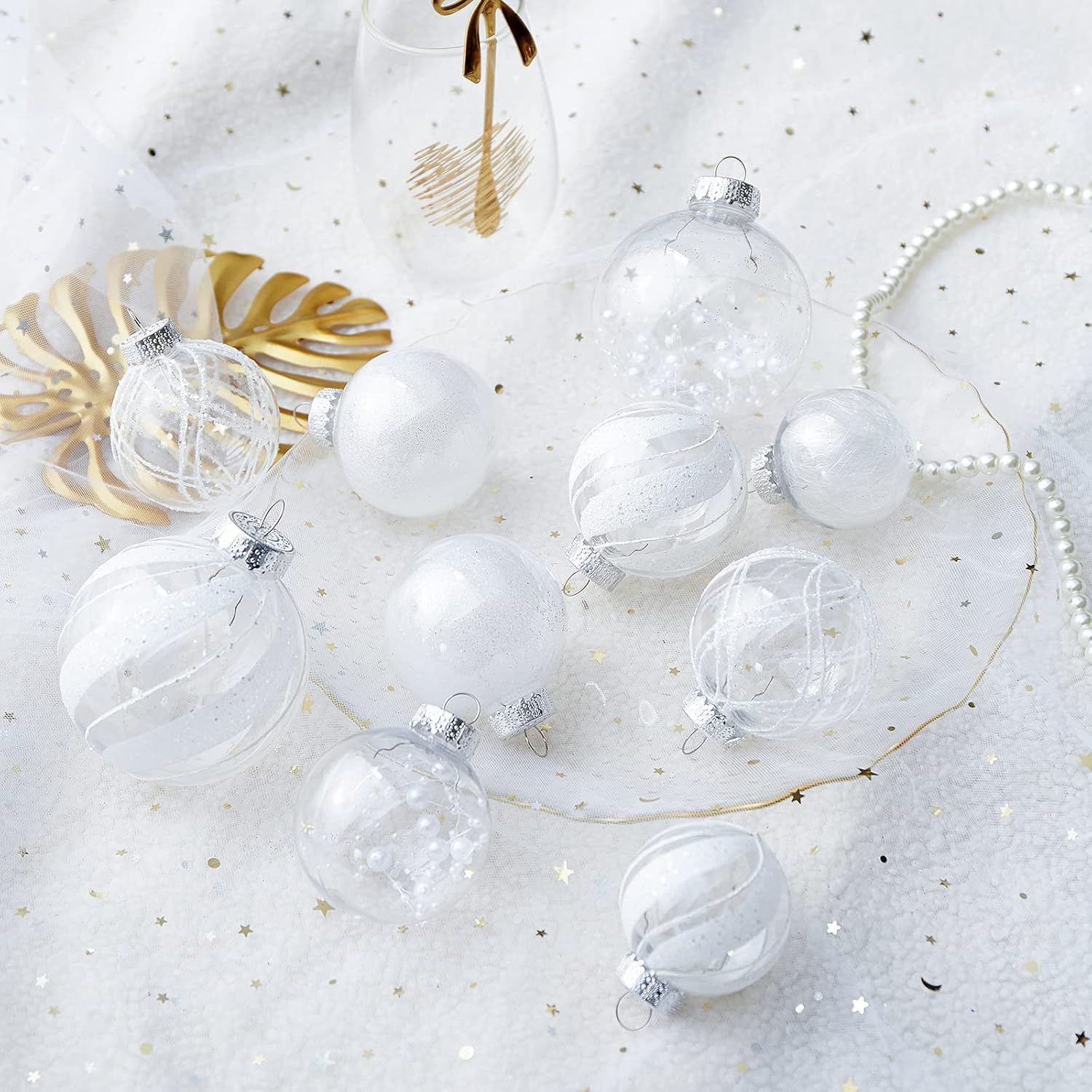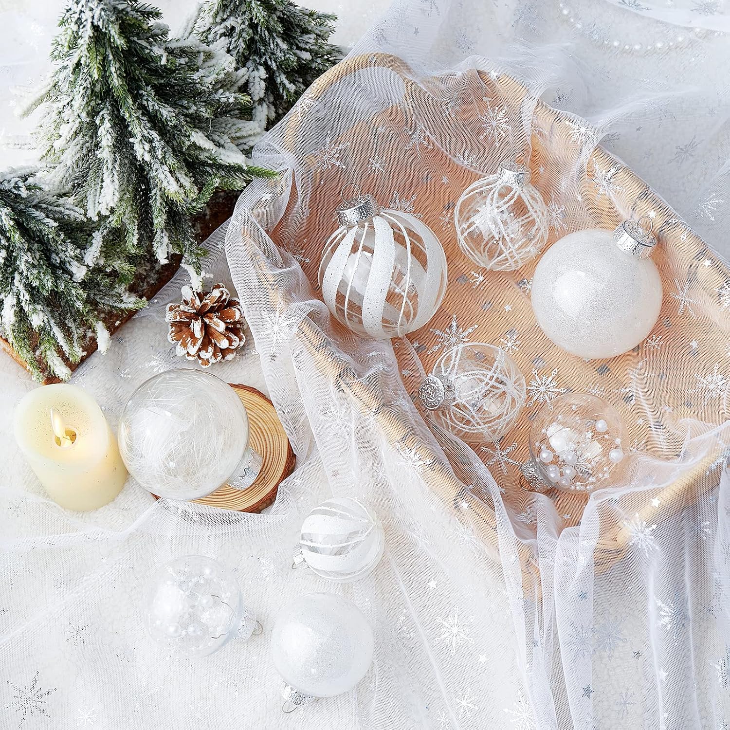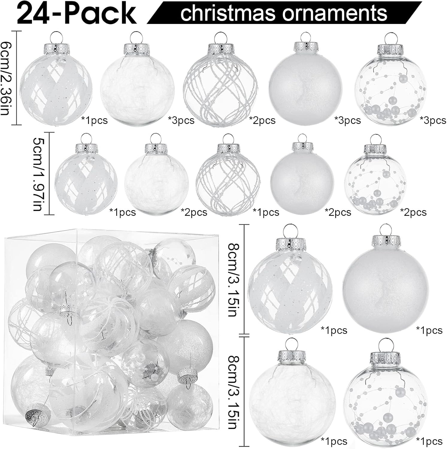 • White Christmas Ball Ornaments--These 24ct clear Christmas decorations are made of durable and environmentally friendly plastic with excellent shatter resistance. These Christmas balls have shiny decorations and a transparent glaze base, which are perfect for hanging on your Xmas tree and decorating your Home with them,this will become part of your vacation.