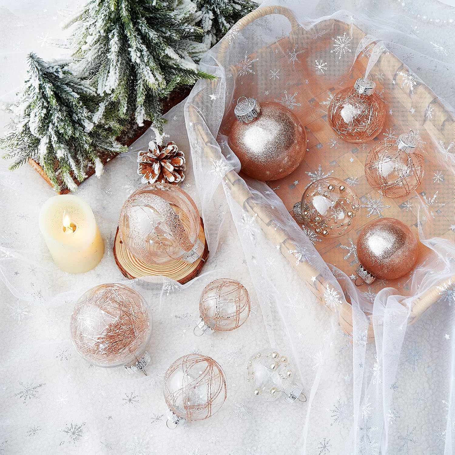 • Rose Gold Christmas Ball Ornaments--These 24 clear Christmas decorations are made of durable and environmentally friendly plastic with excellent shatter resistance. These Christmas balls have shiny decorations and a transparent glaze base, which are perfect for hanging on your Xmas tree and decorating your Home with them,this will become part of your vacation.