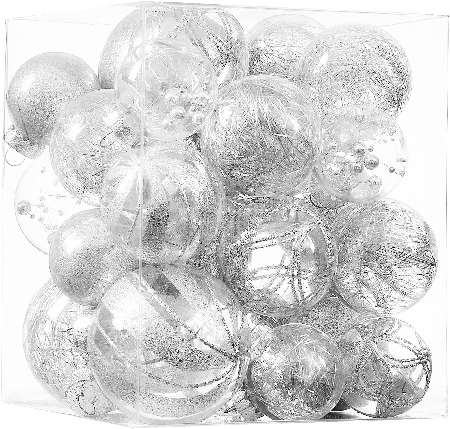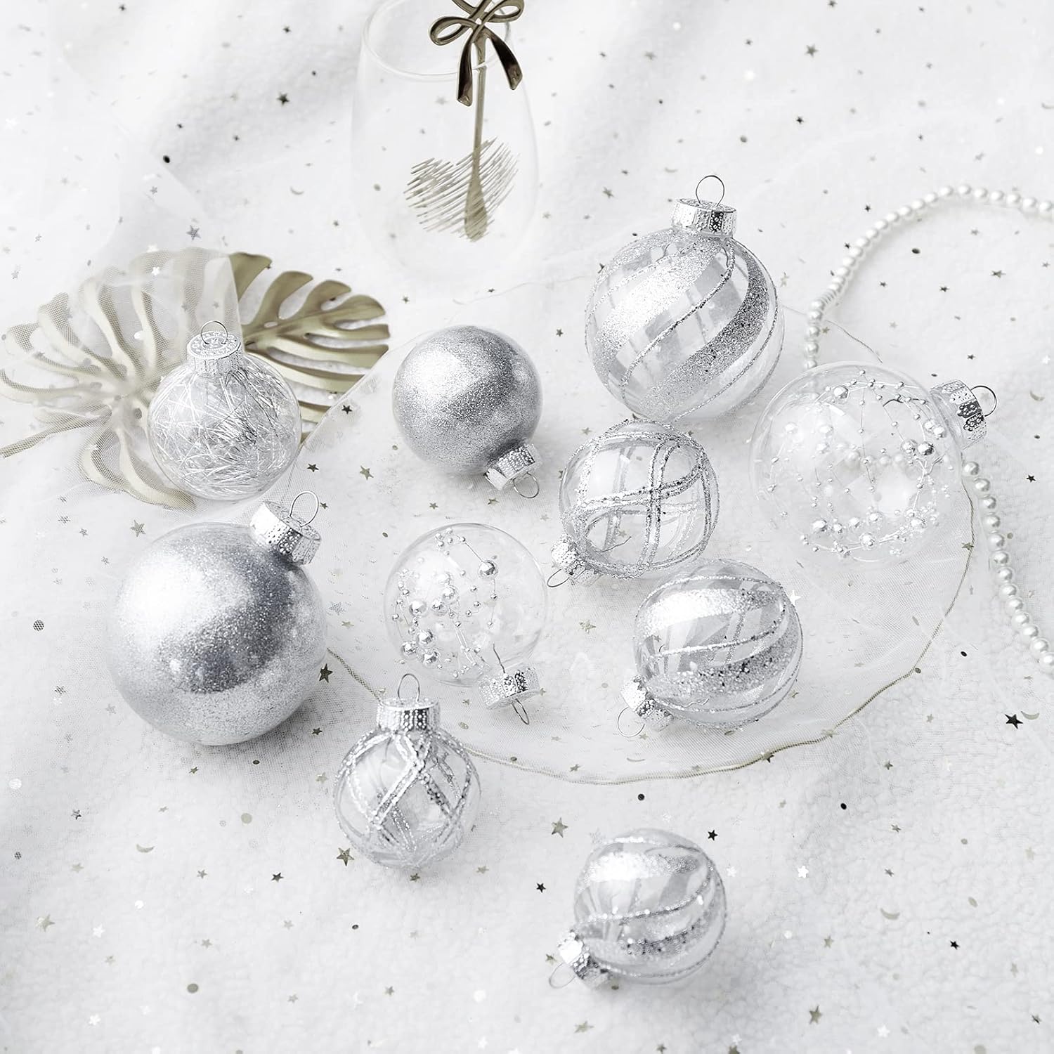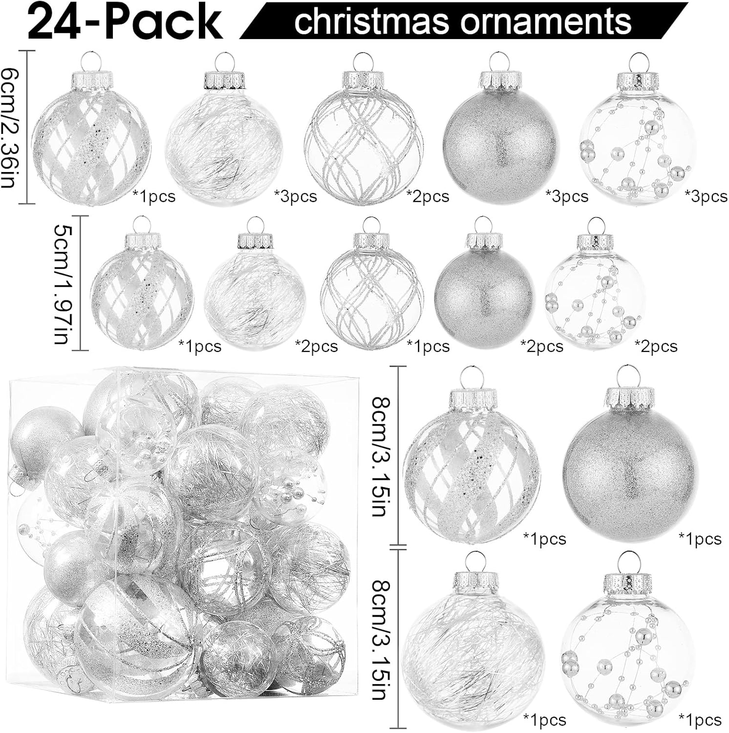• Silver Christmas Ball Ornaments--These 24ct clear Christmas decorations are made of durable and environmentally friendly plastic with excellent shatter resistance. These Christmas balls have shiny decorations and a transparent glaze base, which are perfect for hanging on your Xmas tree and decorating your Home with them,this will become part of your vacation.
