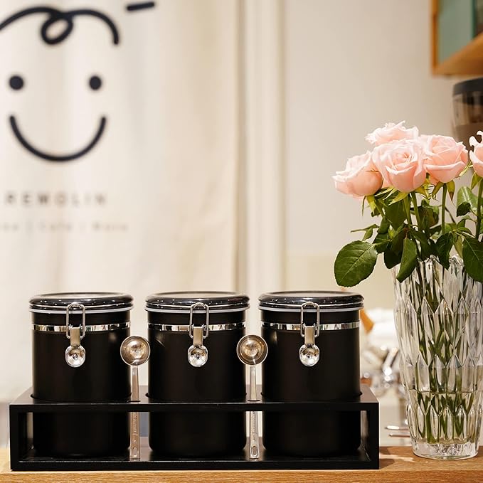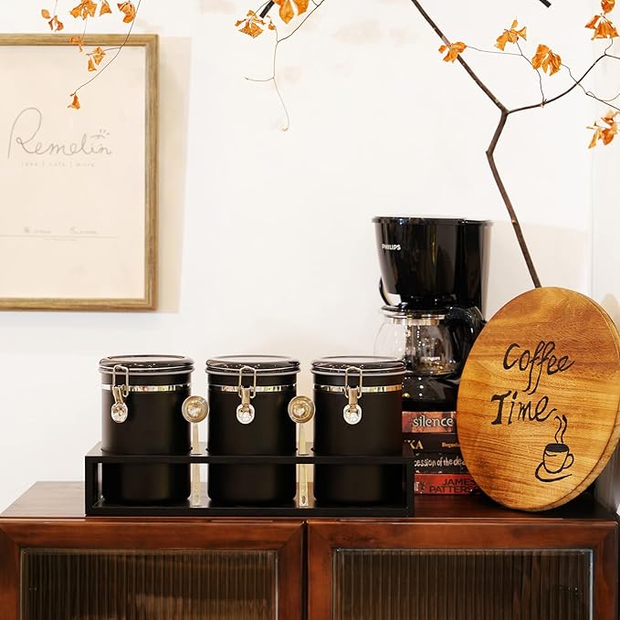 • KEEP THE DESKTOP TIDY: The coffee Containers set includes a wooden storage shelf and 2 Silver iron coffee spoon, which not only facilitates users to organize and categorize similar foods, make the desktop more tidy, and use the cans more conveniently, but also can decorate your desktop and let Your desktop is no longer monotonous.