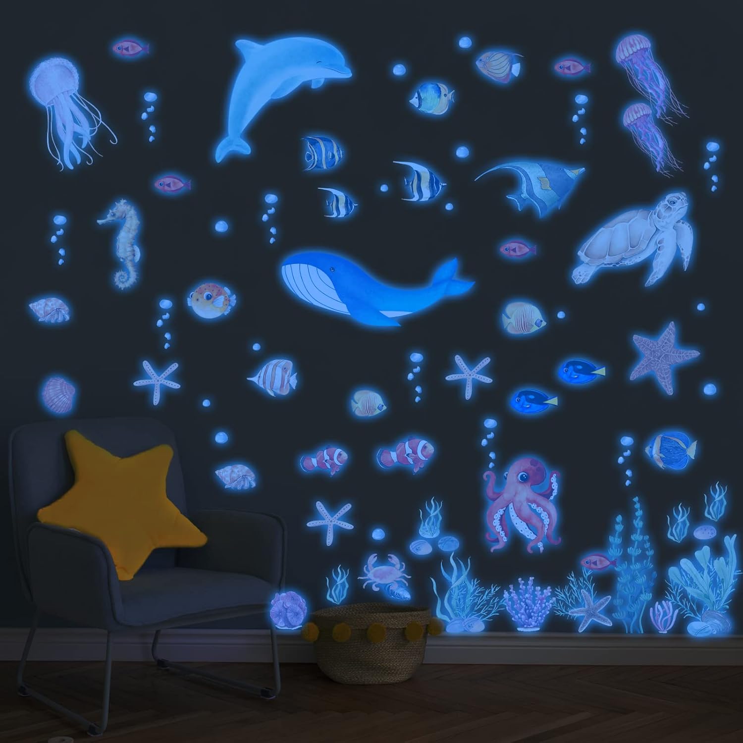 • 【Glow in the Dark】- These underwater wall decals need to absorb light before they emit light. First you need to put them under sunlight,room light or flashlight for 15 to 30 minutes , then turn off the light, the sticker will emit a soft green light without glare.Note:Please ensure the light shines unobstructed onto the decals.