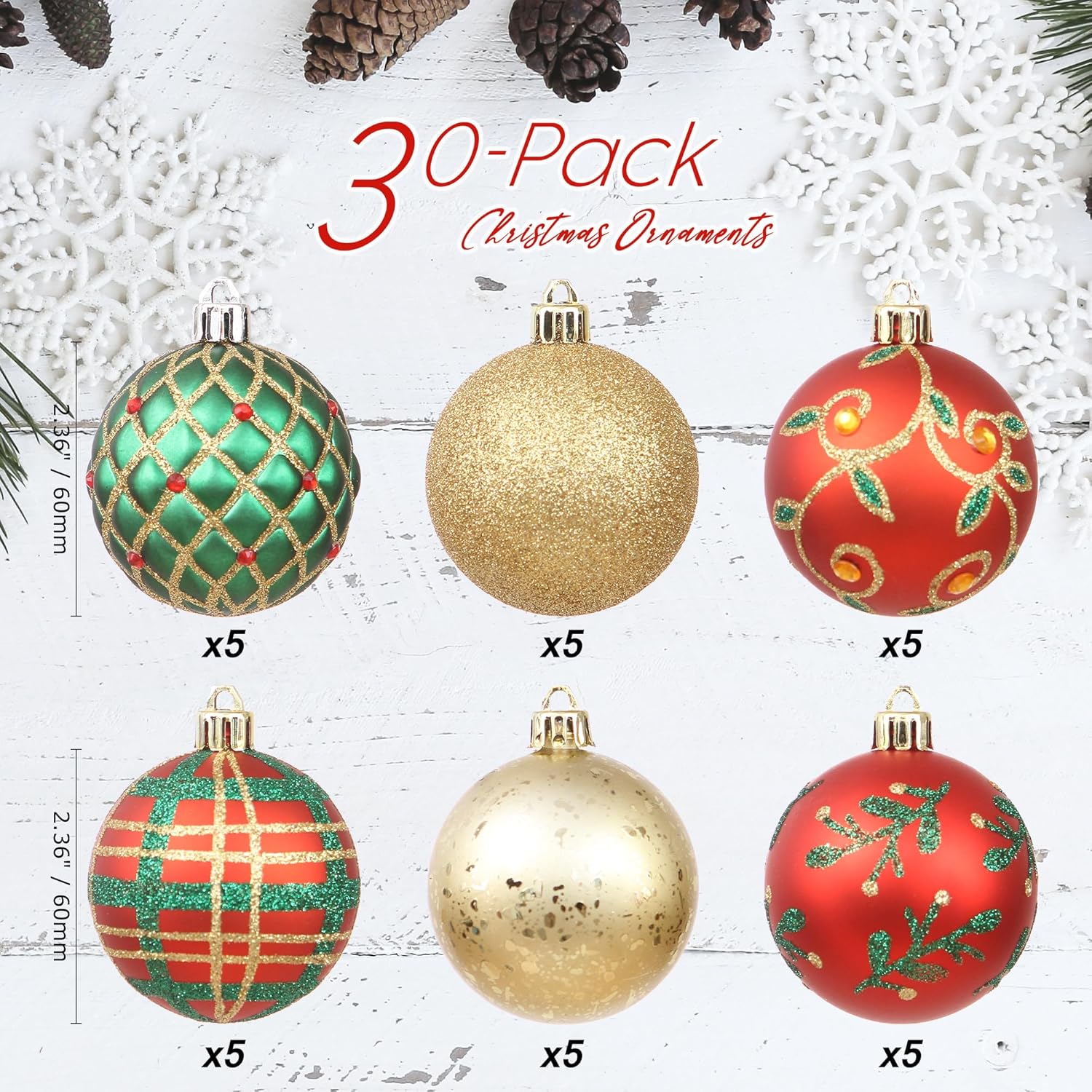 • 30-Pack 2.36 inches Medium Ball Ornaments - This set that you are looking comes with 30 pieces of ball ornaments in 1 box. Ball ornaments measure about 2.36"/60mm in diameter which is appropriate for a medium/big tree, wreath and garland