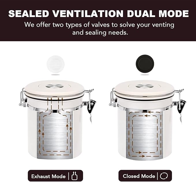 • 【TWO EXHAUST MODES】The canister features a CO₂ valve system and a silicone seal to lock in freshness and keep out moisture and air. A silicone gasket around the edge of the lid ensures an airtight seal when the lid is closed. Storing your coffee beans in this well-designed canister helps extend their freshness and ensures that every cup, even weeks later, tastes as good as the first.