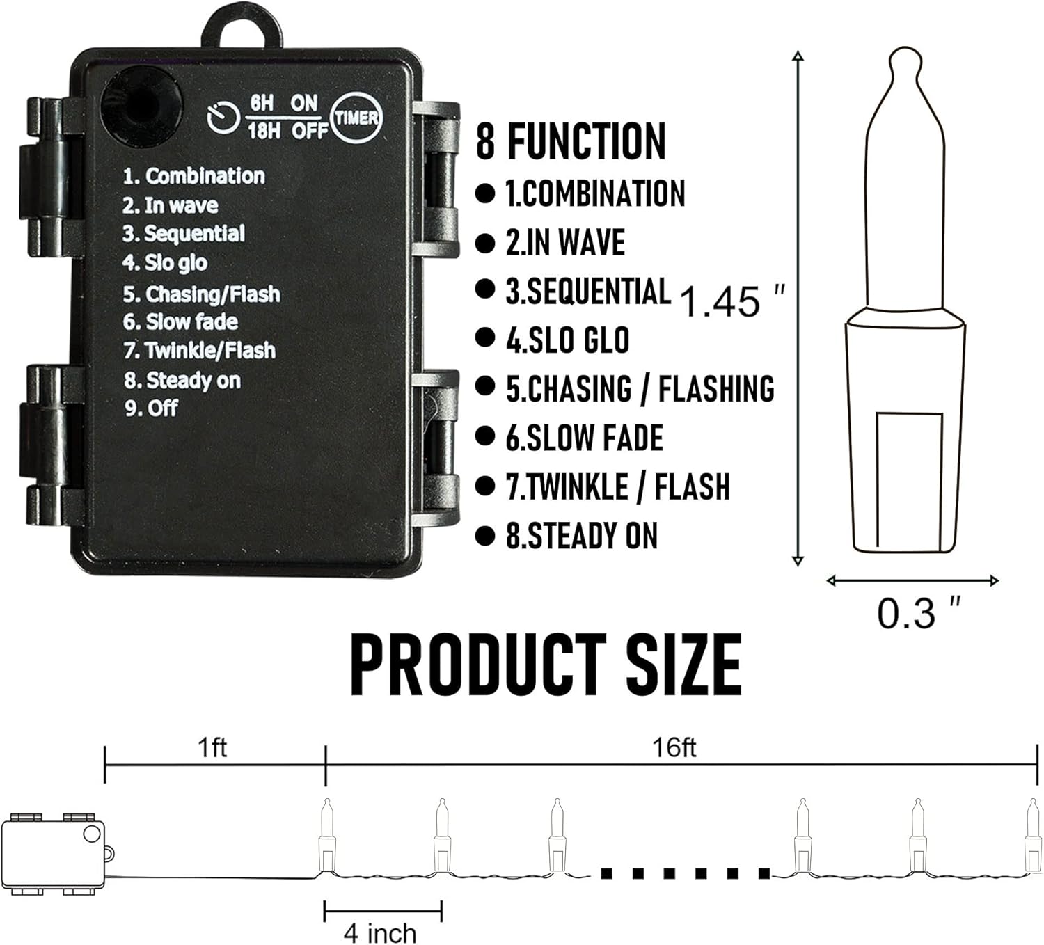 • 8 Lighting Modes: Dazzle Bright mini string lights has 8 different lighting methods, including combination, in wave, sequential, slo glo, chasing/flash, slow fade, twinkle/flash, steady on. Press the button on the battery box to select the lighting mode you like.