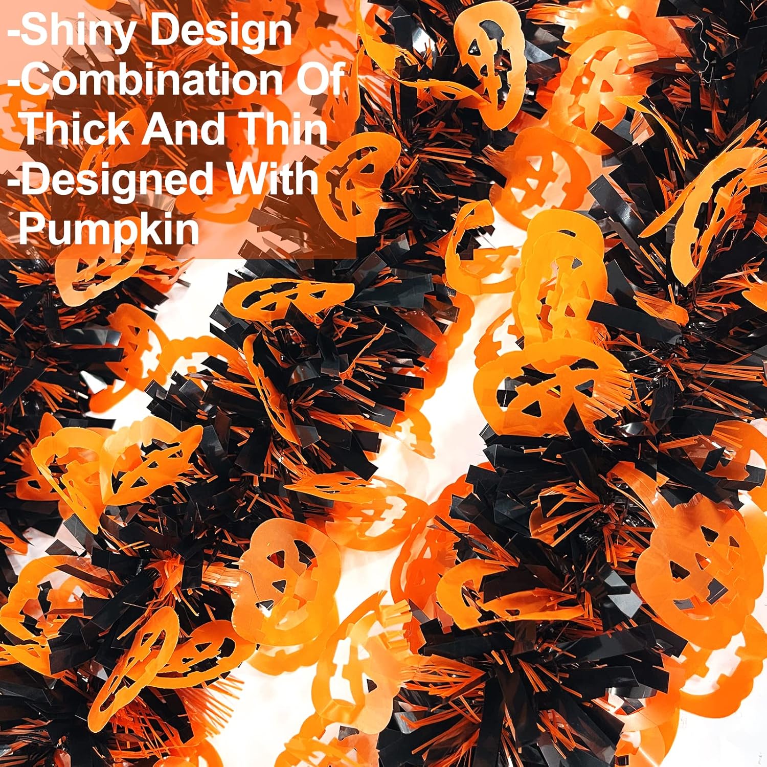 TURNMEON 2 Pack Halloween Garland Total 66 Ft Halloween Tinsel Garland with Black Orange Pumpkin Metallic Twist Black Tinsel Garlands Outdoor Halloweens Decorations Indoor for Home Mantle Door Tree