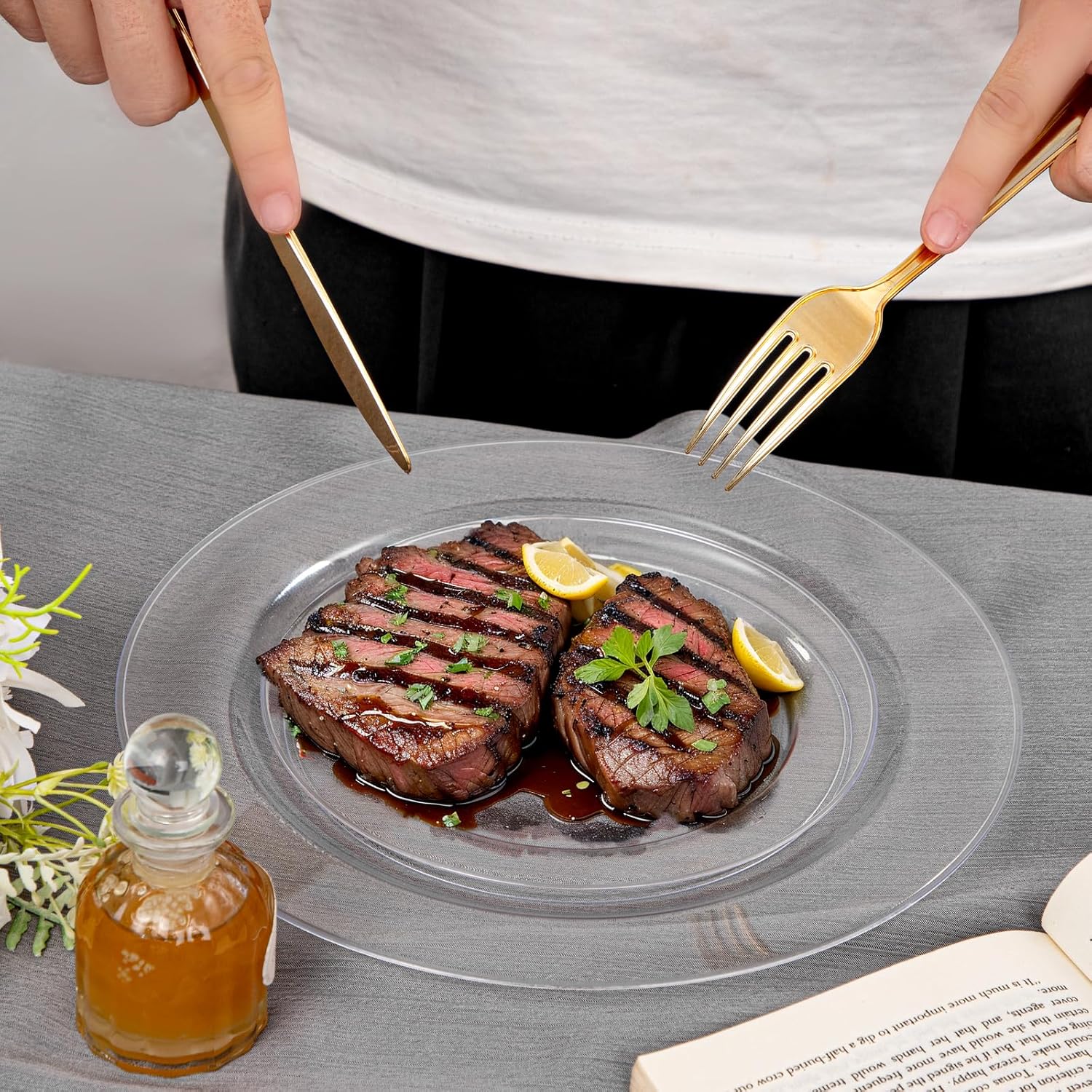 • REUSABLE: Our clear dessert plates and clear dinner plates are unpatterned and unprinted. Wash them with water after use and they will look like new. So, if you're diligent enough, you can wash these clear disposable plates and then dry them for multiple uses.