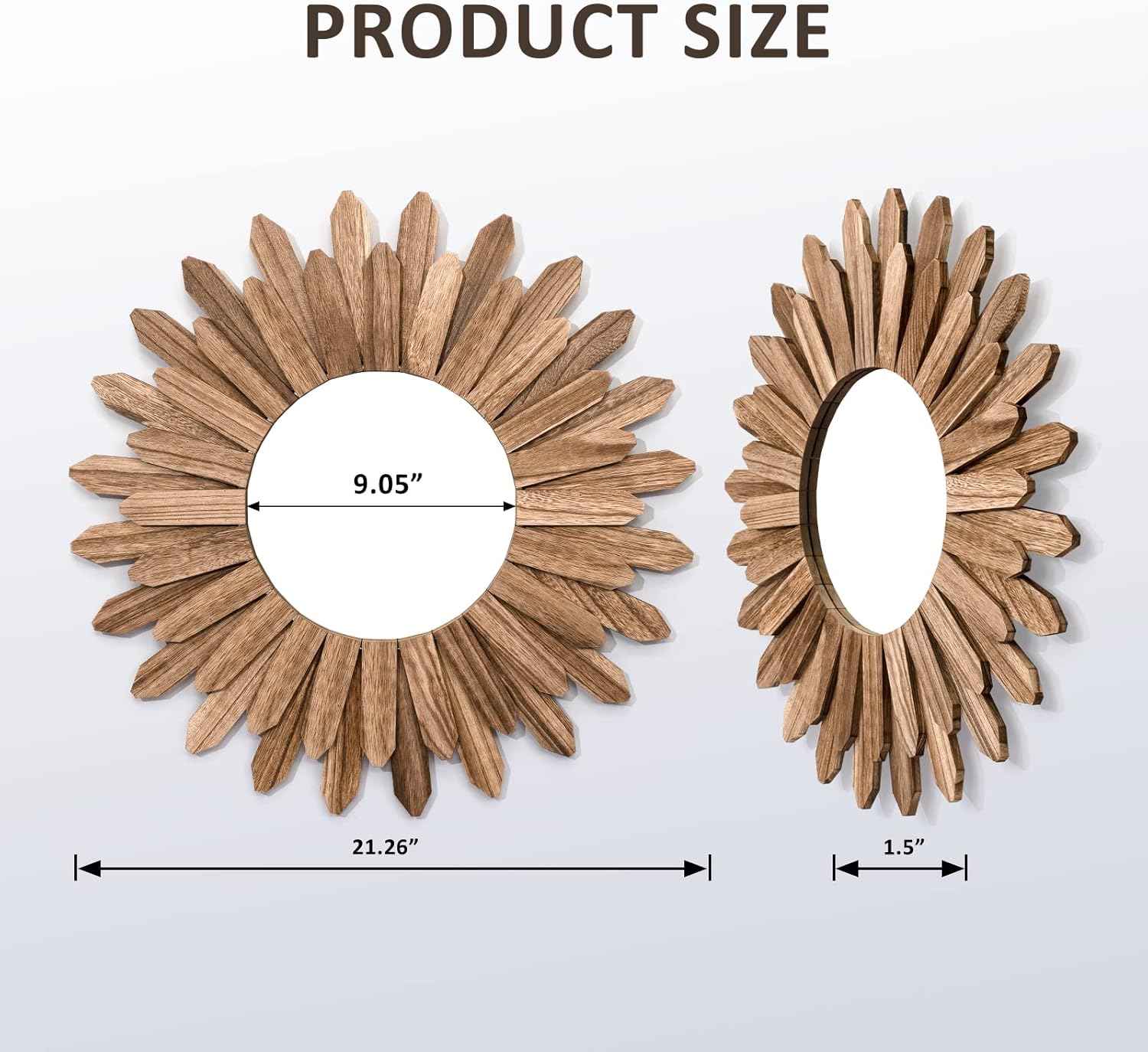 • Easy to Hang: Measure at 21 inch diameter with wood frame and diameter of 9 inch for mirror; Hang this stunning mirror in your bedroom over your bed, in your hallway or entryway, over your living room sofa.No any assembly, quite easy to hang on the wall; Comes with anchor and screw