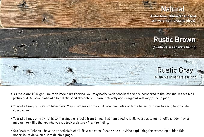 • Please note: The coloring of these shelves is Natural. They are not stained or finished in any way. All coloring is naturally occurring from decades in a working barn. When shelves are cut to size, the ends may be lighter or a different color, as the inside of the shelf has not been exposed to the elements of the barn. Please be sure to look at all of the listing pictures.