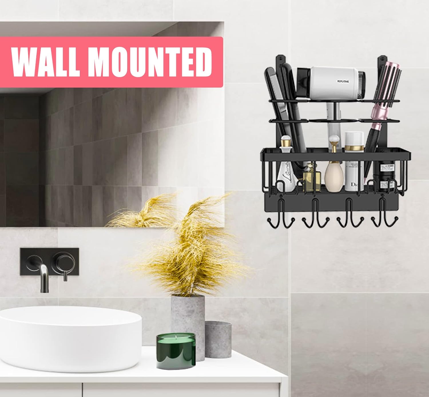 • SPACE SAVING : 3 compartments provide the perfect solution to store your hairdryer, curling iron, flat iron, combs, and brushes. A large basket helps to collect your other styling tools or bath supplies.8 hooks below can as towel hook and coats hook. Get rid of the clutter on the countertops!