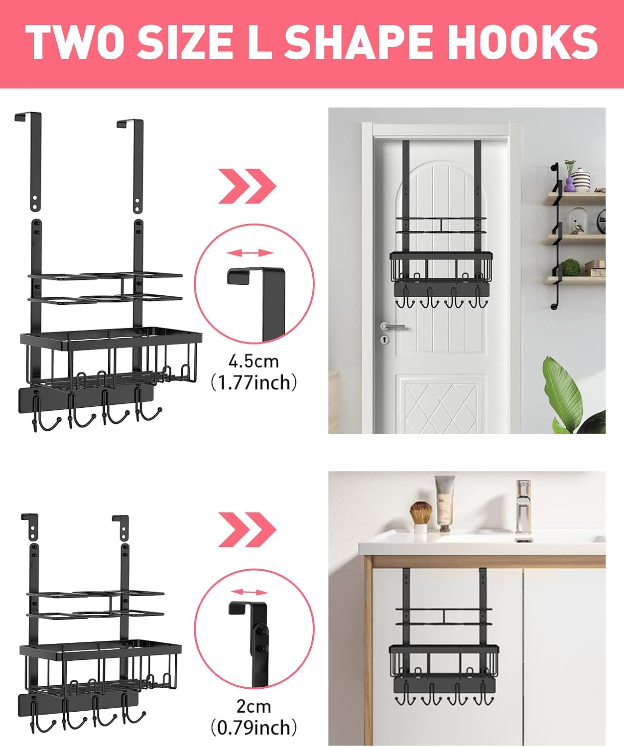 • MUTIPLE USES : Hanging on the bathroom/cabinet door or Wall Mount. Come with two size L shape hang hook. The short hang hook fits over cabinet doors up to 0.79 inches /2 cm thick. The long hang hook fits over bedroom/bathroom doors up to 1.77 inches /4.5 cm thick. Easily installs on bedroom/bathroom or hang over the shower/cabinet door with the included hardware.