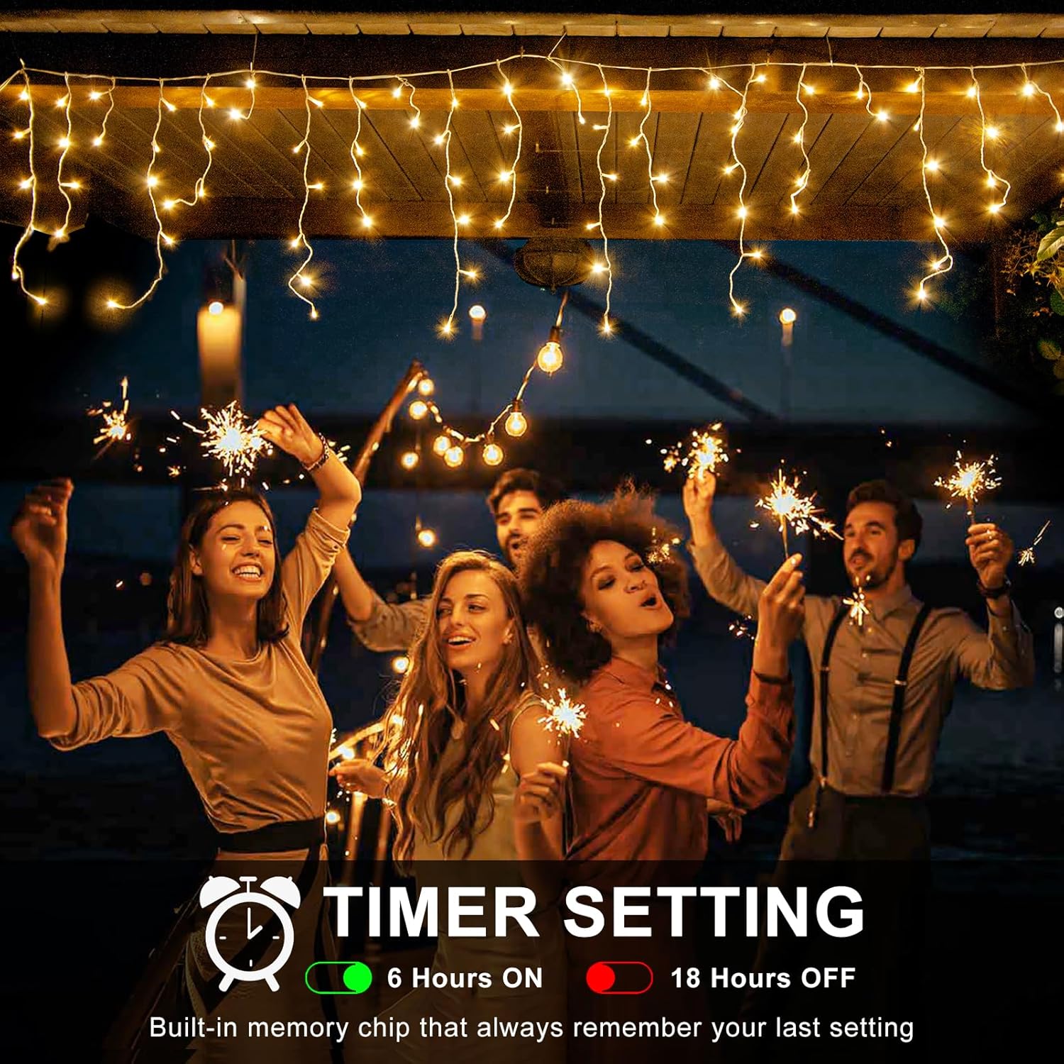 • [Timer & Memory Function] - Press and hold the button of the plug for 3s until the green light comes on, then the timer function starts, 6 hours on and 18 hours off. If you want to keep the led icicle lights on all the time, just press the button for 3s to cancel the timer function. A built-in memory chip will remember the last light mode of the lights so when the power is restored, they will resume in the last state they were in.