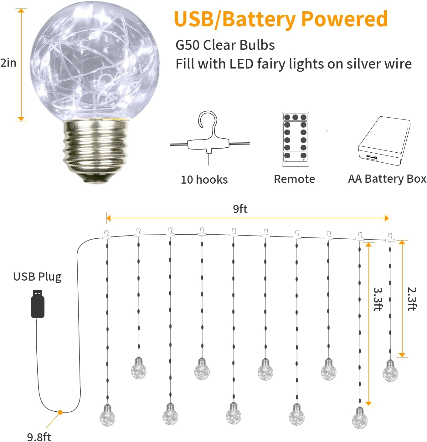 • [ 9.8x3.3 ft ] Wishing Ball Curtain Lights: The edison look bulbs are filled with fairy-like copper wire LEDs, hanging on silver wire curtain lights, to create a soft mode for just any place, add charm and character to your activities and provide relaxing mood lighting for party