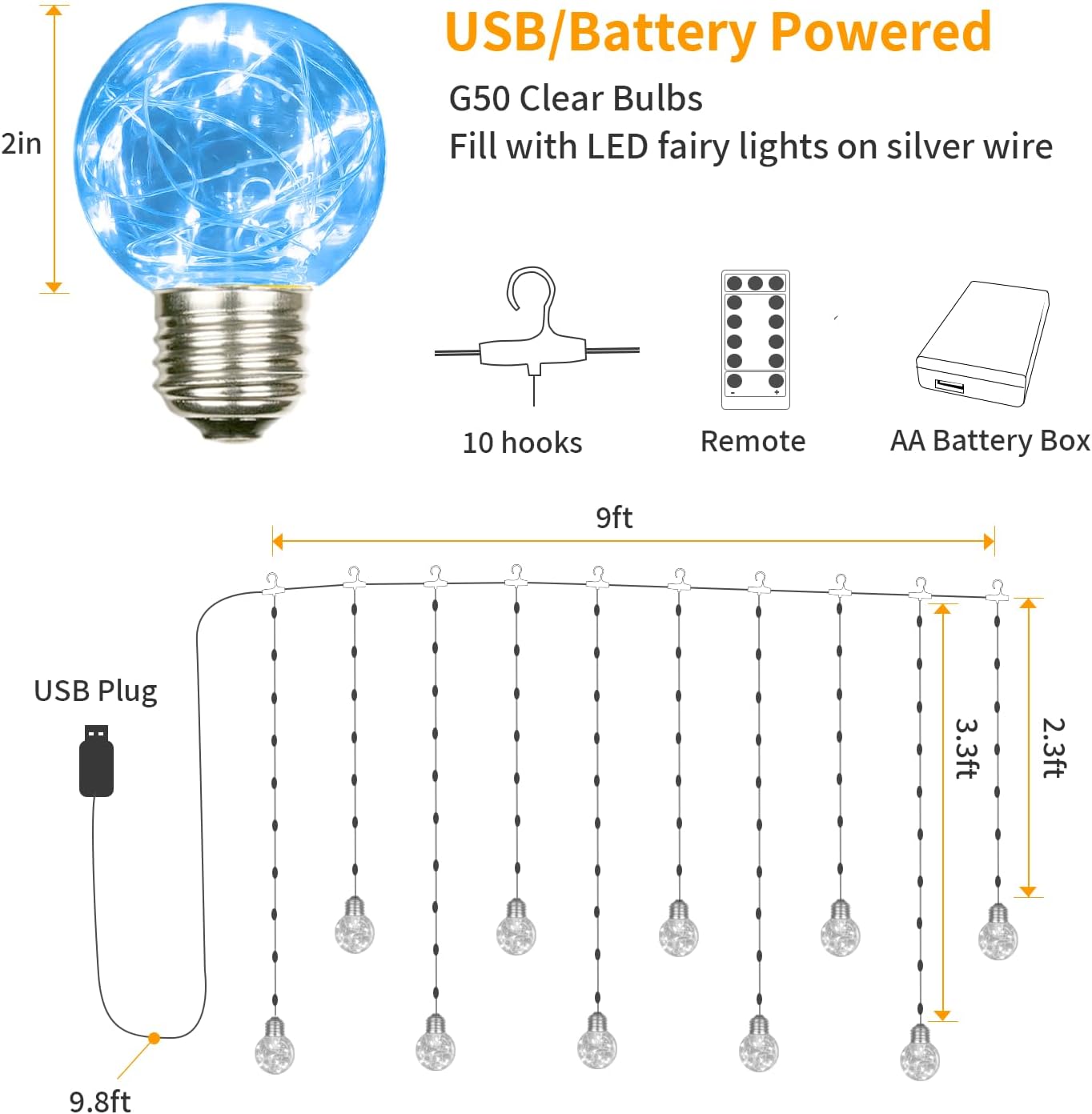 • [ 9.8x3.3 ft ] Wishing Ball Curtain Lights: The edison look bulbs are filled with fairy-like copper wire LEDs, hanging on silver wire curtain lights, to create a soft mode for just any place, add charm and character to your activities and provide relaxing mood lighting for party