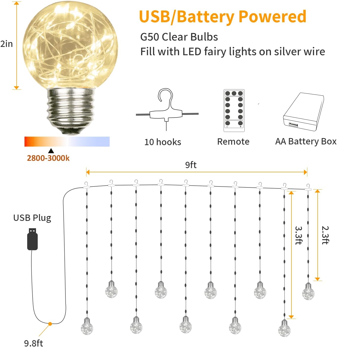 • [ 9.8 x 3.3FT ] Wishing Ball Curtain Lights: The edison look bulbs are filled with fairy-like copper wire LEDs, hanging on silver wire curtain lights, to create a soft mode for just any place, add charm and character to your activities and provide relaxing mood lighting for party & holiday