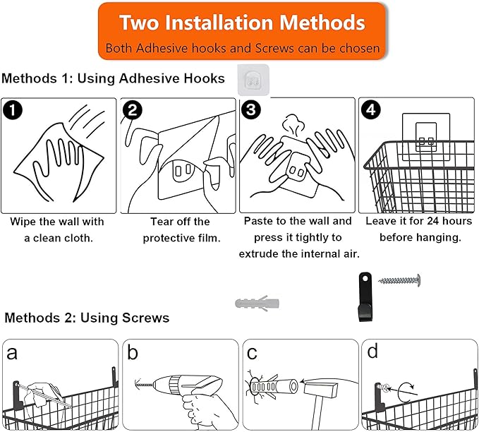 • 🍎【Sturdy wire baskets that can hold 40 pounds】 These baskets are made of durable steel wire with durable anti-rust and anti-corrosion coating, as well as wall-mounted hardware and hooks, which can hold 40 pounds. (Note: If you use non-marking paste instead of screws, the basket can hold 10 pounds)