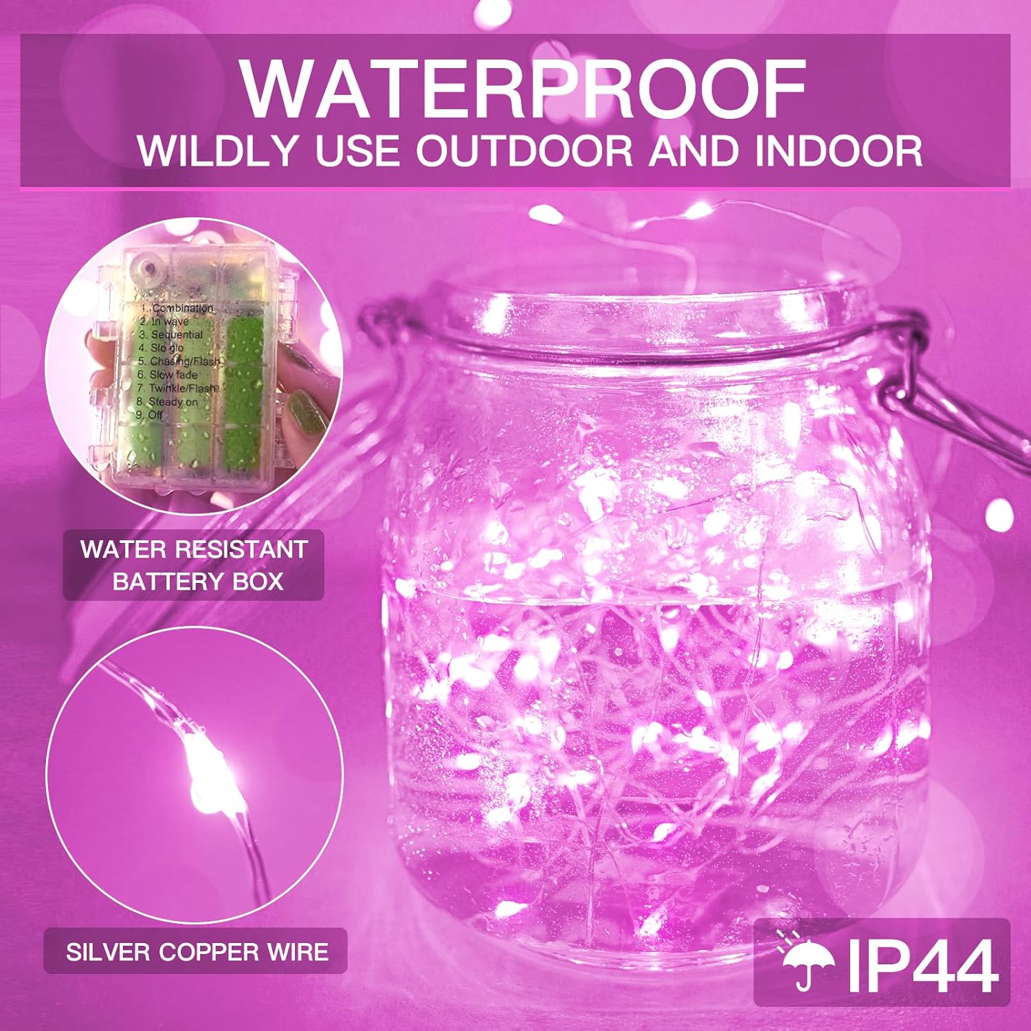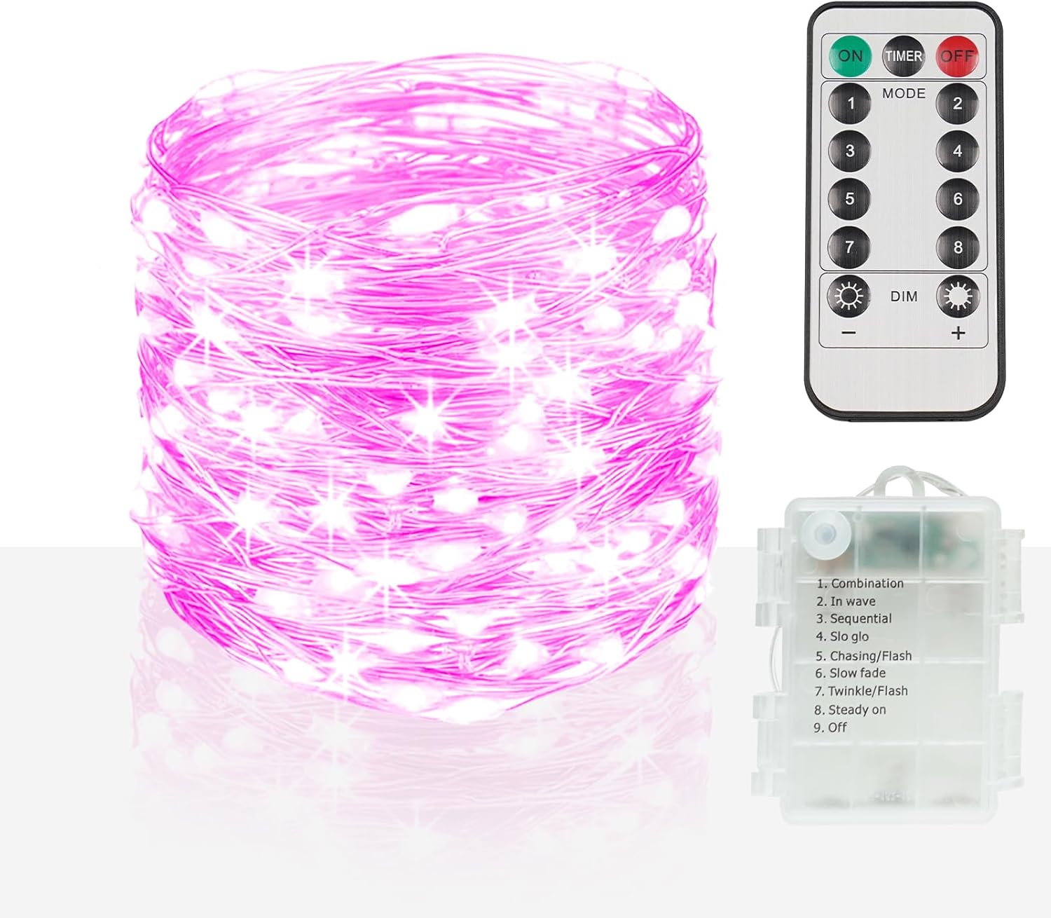 suddus Pink Fairy Lights Battery Operated Outdoor Waterproof, 33ft 100 Led String Lights with Remote, Twinkle Lights for Bedroom, Dorm, Tapestry, Christmas, Party Decorations