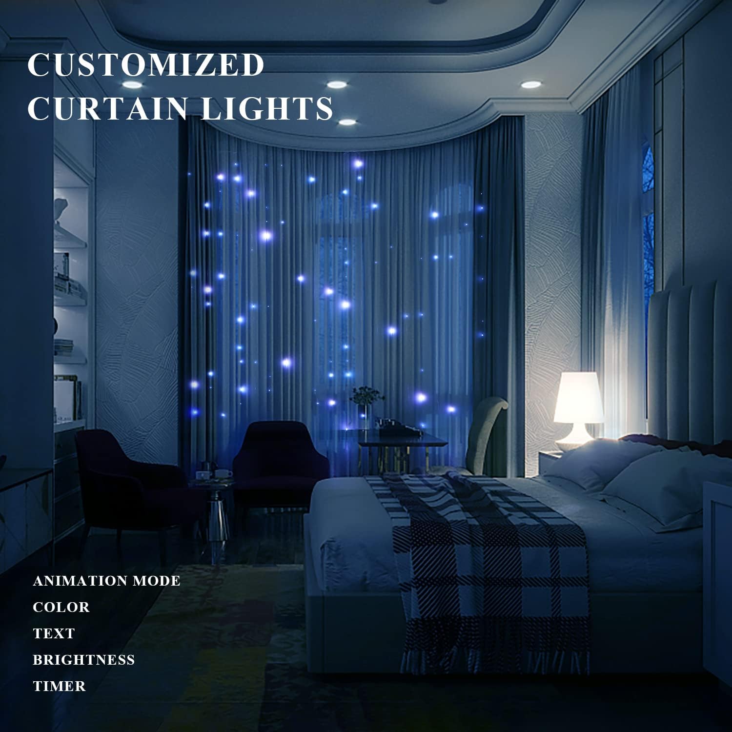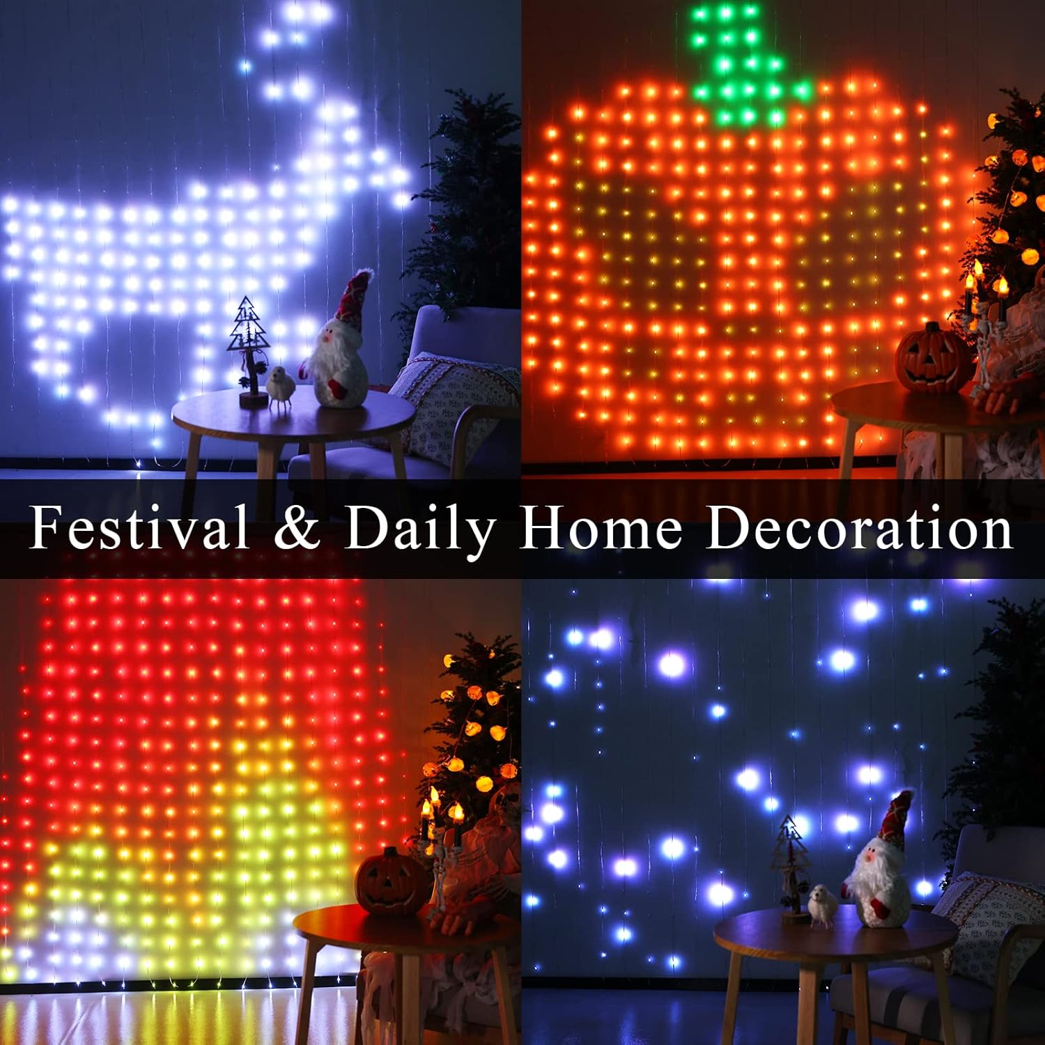 • Multiple light modes and DIY function- The lights have multiple animation options, including pumpkins, skulls, Santa Claus, Deer, Maple Leaf, the American flag, Meteor showers, snows, hearts, and other animations. It can be both daily and festival decorations. There are 12 fixed color and RGB color selection areas on the APP, you can choose colors, draw, or enter text to meet your needs of personalizing and customizing, creating unlimited ideas in the color-changing curtain lights.