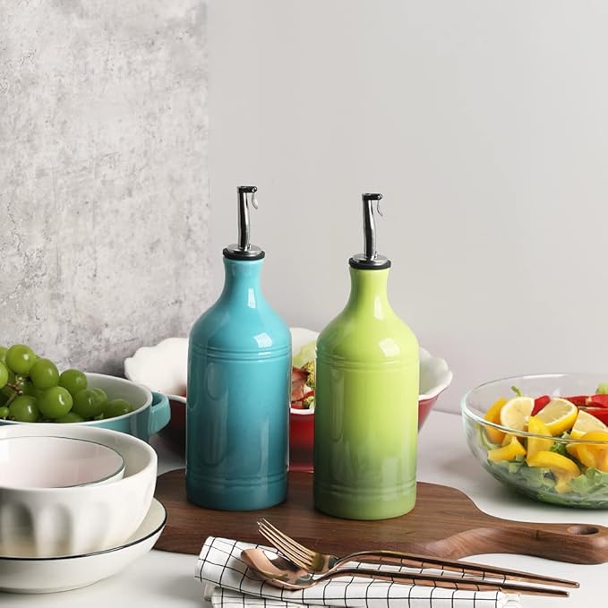 • Easy to Hold, Elegant Dispenser - The oill dispenser bottle has a smooth curve for hold easily. And the brightly colored oil and vinegar bottles would look great on counter/table or your cupboard!