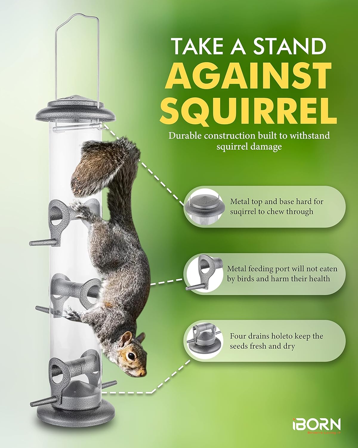 • 【Metal Bird Feeder】Metal top & base, aluminium feeding ports survived from Squirrel Damaging. Durable quality to sustain wear and worn outdoors. We adopt advanced technique for metal finishing to help the metal last longer when used outdoors.