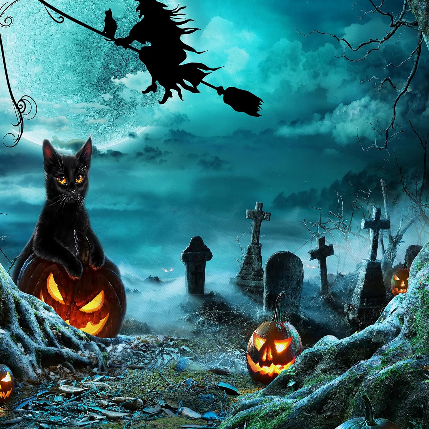 LB Teal Halloween Witch Tapestry Horror Black Cat Dead Tree in Graveyard Full Moon Night Tapestry Wall Art Spooky Pumpkin Wall Decor for Bedroom Living Room Dorm Holiday Party Decor 60x40 Inch