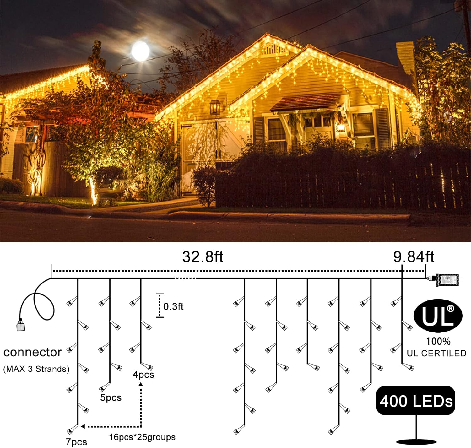 Icicle Lights for Outside 33ft 400 LED Icicle Christmas Lights Outdoor 8 Modes with 75 Drops, Plug in Christmas Light Waterproof for Indoor Holiday Wedding Xmas Decorations, Warm White