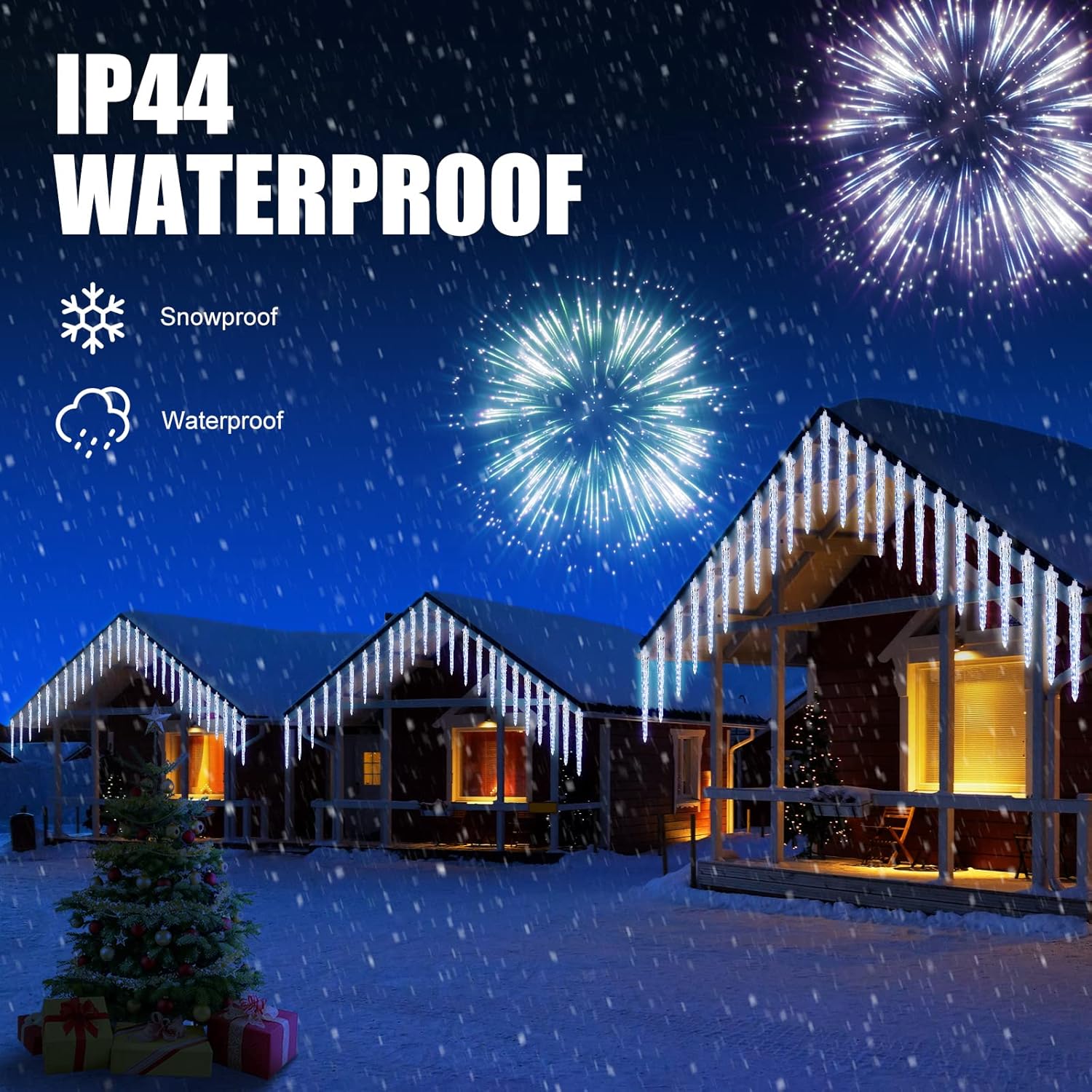 • 【Weatherproof and Flexible】Our icicle Christmas lights are waterproof with an IP44 rating; They can be easily installed with a gripper, cable tie, or cup hook and placed anywhere necessary, such as on a living room or window, weaved through flowers and trees, or strung along the wall or banisters. Note: The AC plug should be protected from rain when using outdoors.