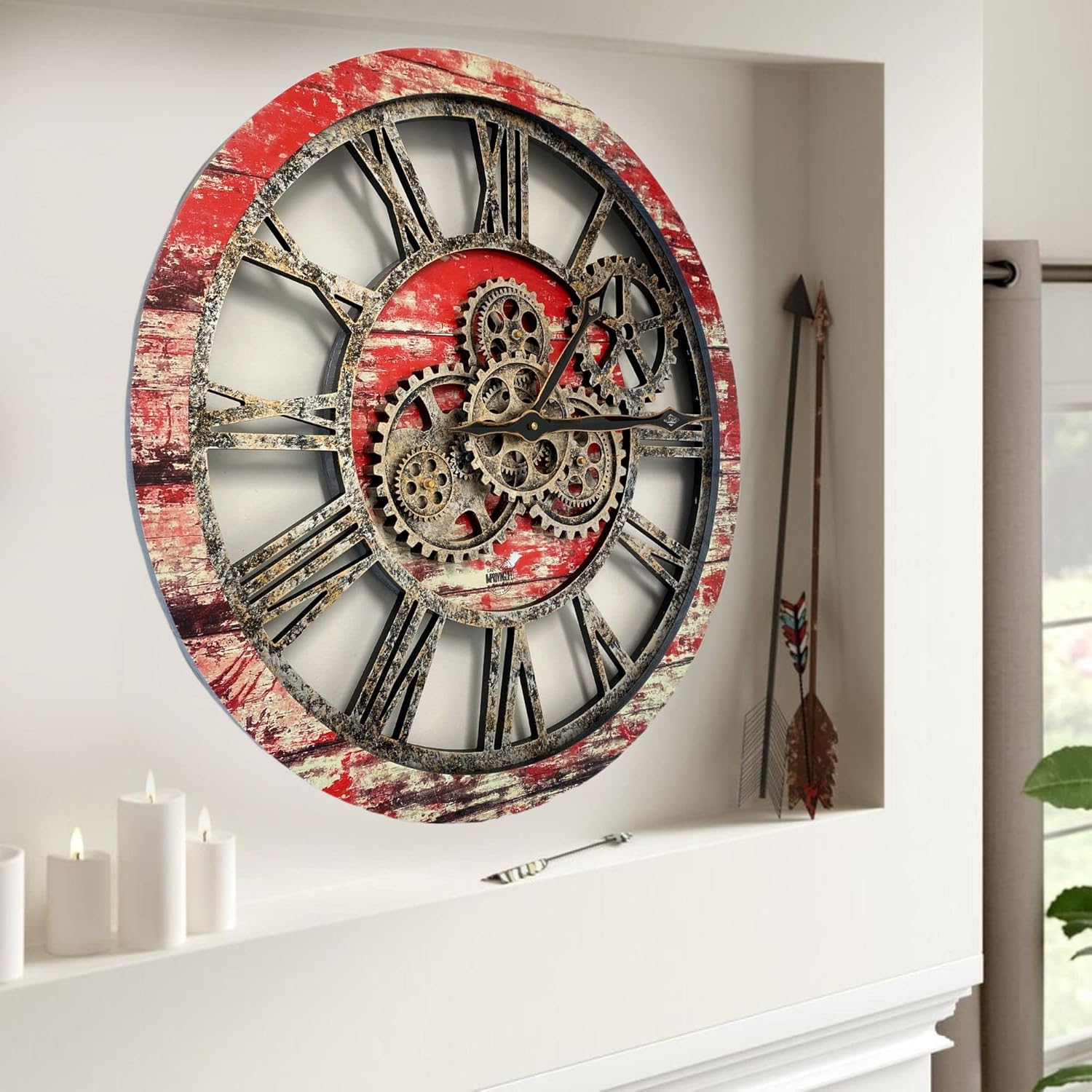 The Gears Clock The Original Real Moving Gear Wall Clock Vintage Industrial Oversized Rustic Farmhouse (24 inch (60cm),Red Lava)