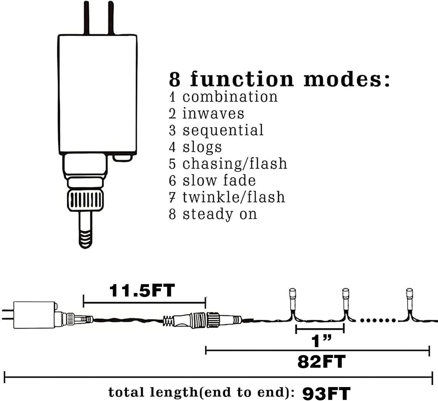 • Light Specifications: With 1000 LED lights, each Christmas string lights is 93.5 ft long in total, wire with LED bulbs is 82 ft, lead cord without lights is 11.5 ft, spacing between per LED bulb is 1 inch. Waterproof design allows it to be used indoors and outdoors. NOTE: this LED string lights could not be extended or connected together.