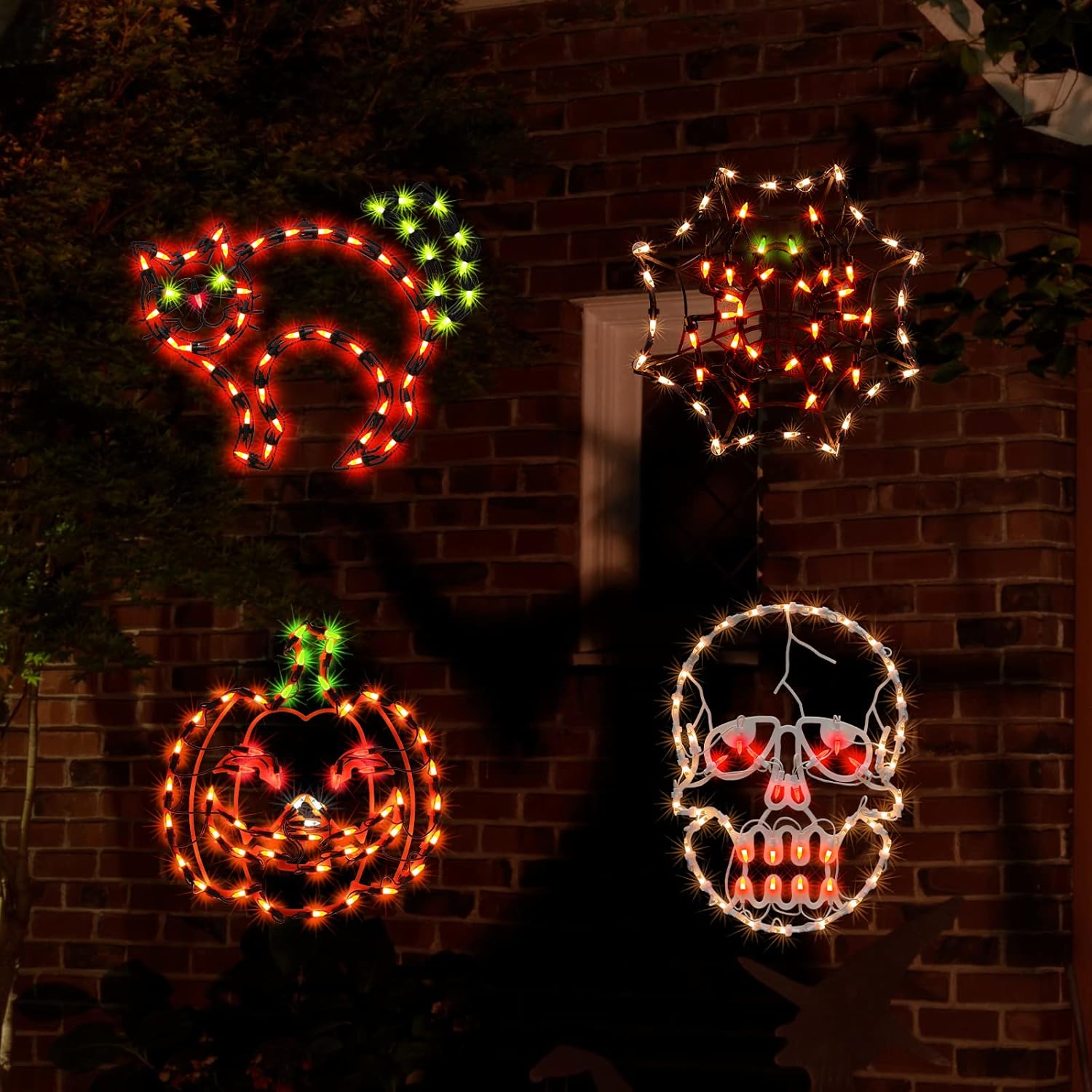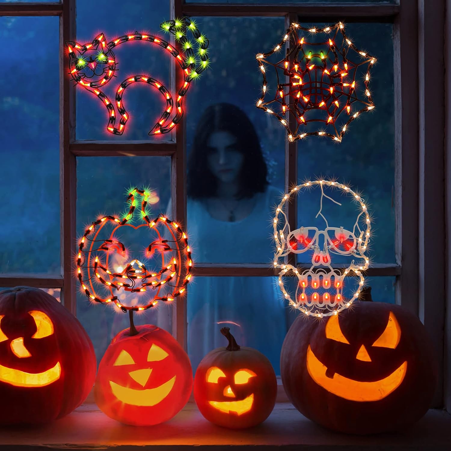 • Halloween Window Silhouette Decoration: 50 mini lights Cobwet Light measures 12.8 x 12.8 -Inch;50 mini lights Skull Light measures 17 x 11.8 -Inch; 50 mini lights Cat Light measures 17 x 11.8 -Inch; 50 mini lights Jack-O-Lantern Light measures 12.8 x 12.8 -Inch; 8 pcs replacement bulbs,4 flasher bulb, 8pcs spare fuses,8 pcs zip ties and 4 pcs suction cup included.