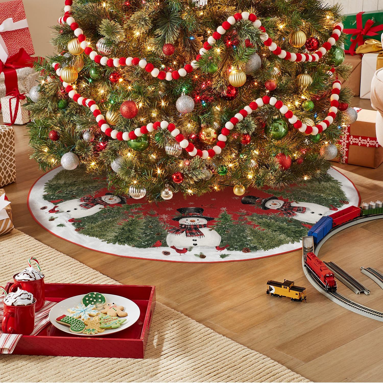 AVOIN colorlife Cardinals Cedar Snowman with Scarf Christmas Tree Skirt, Xmas Winter Holiday Party Tree Mat Indoor Outdoor Decoration 48 Inch
