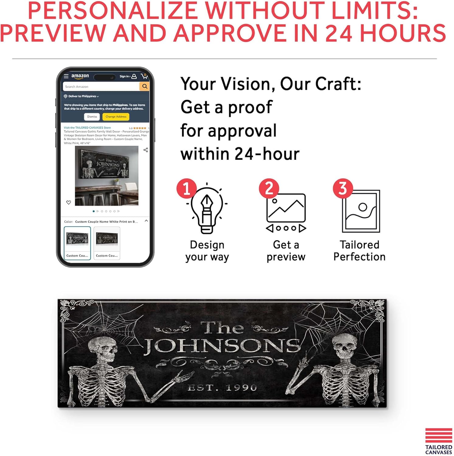 Tailored Canvases Gothic Family Wall Decor - Personalized Grunge Vintage Skeleton Room Decor for Home, Halloween Lovers, Men & Women for Bedroom, Living Room - Custom Couple Name, White Print, 48"x16"