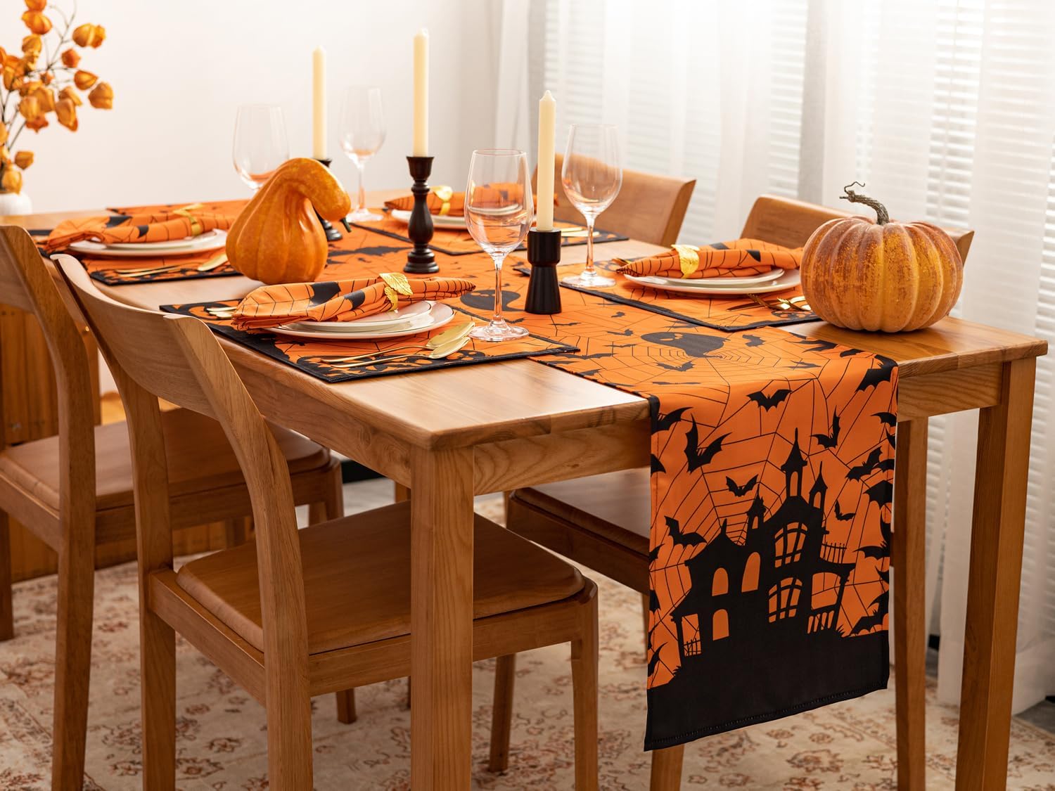 • ADD A CREEPY FINISHING TOUCH: This printed table runner is the perfect addition to decorate your tabletop for Halloween parties; The black haunted house design and hanging bats and spider web over the orange table runner make a cute, festive decoration.
