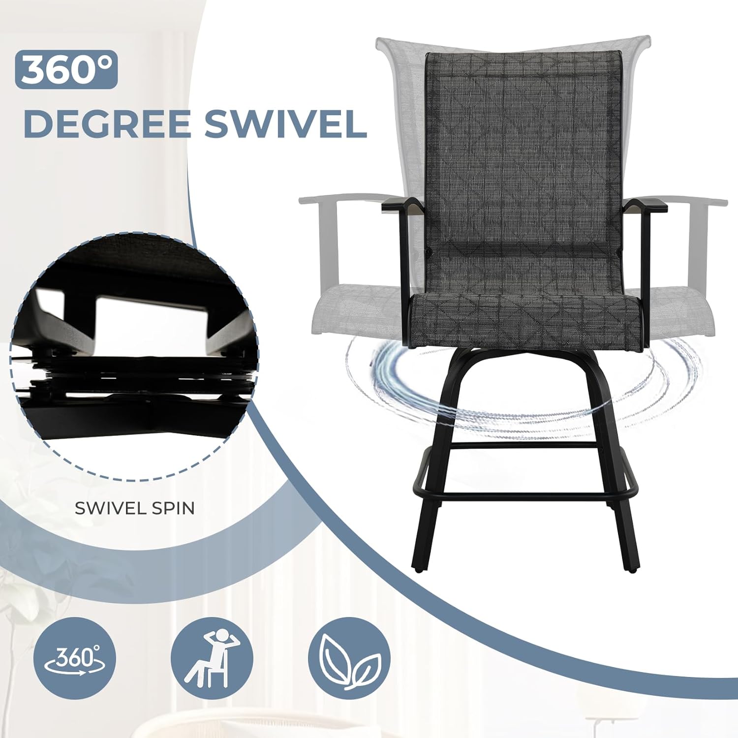 • FUNCTIONAL FEATURES: The balcony bar chair with 360° free rotation design, combined with the reinforced design of double support ribs at the bottom, can enjoy the outdoor scenery 360° freely