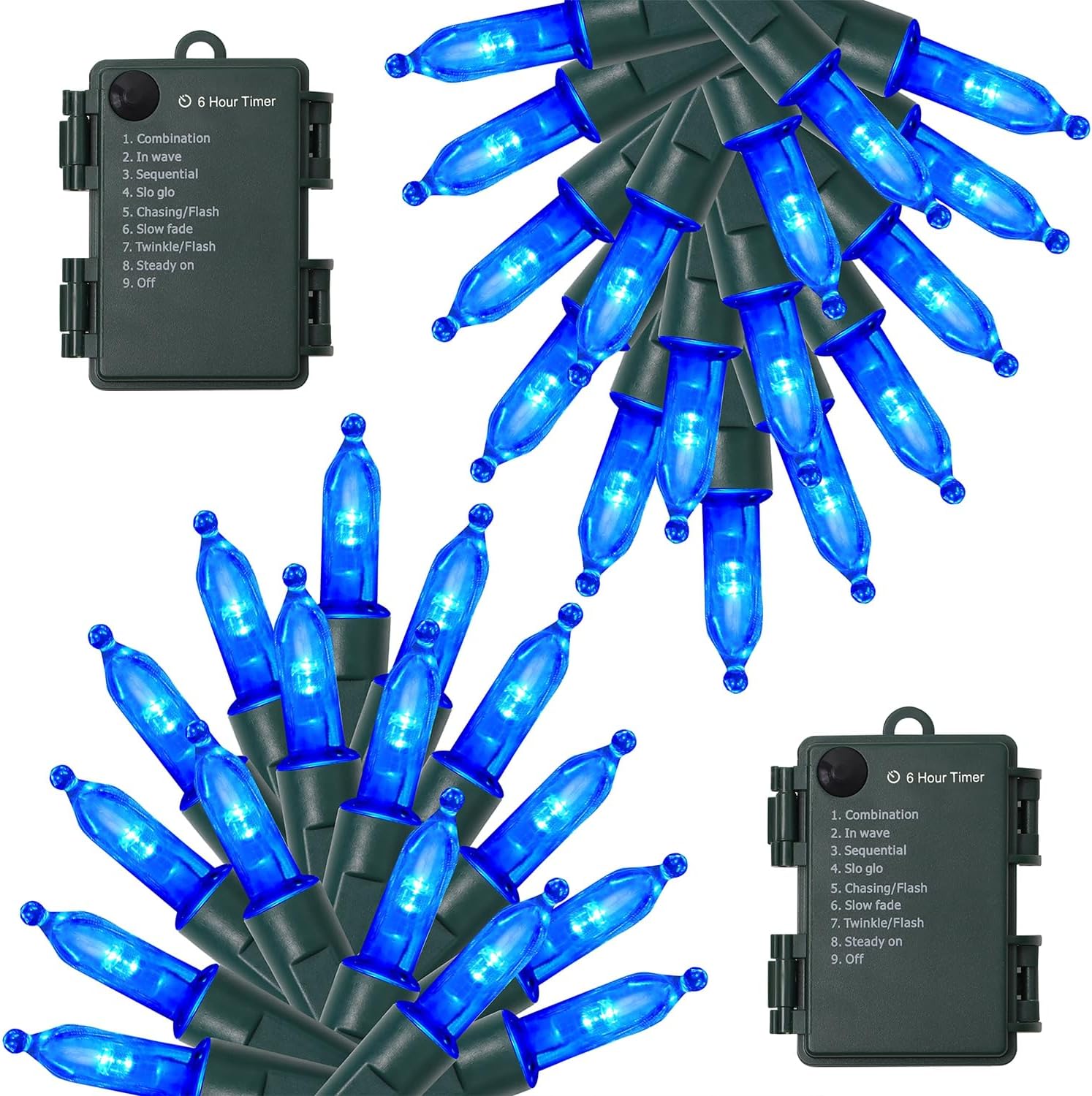 • [8 Lighting Modes]: WATERGLIDE 2 pack 50LED Christmas blue mini string lights have 8 lighting modes for you to choose - Combination, In waves, Sequential, Slow Glow, Chasing/Flash, Slow fade, Twinkle/Flash, Steady on. Adjust the lighting modes by pressing the round button on the battery case