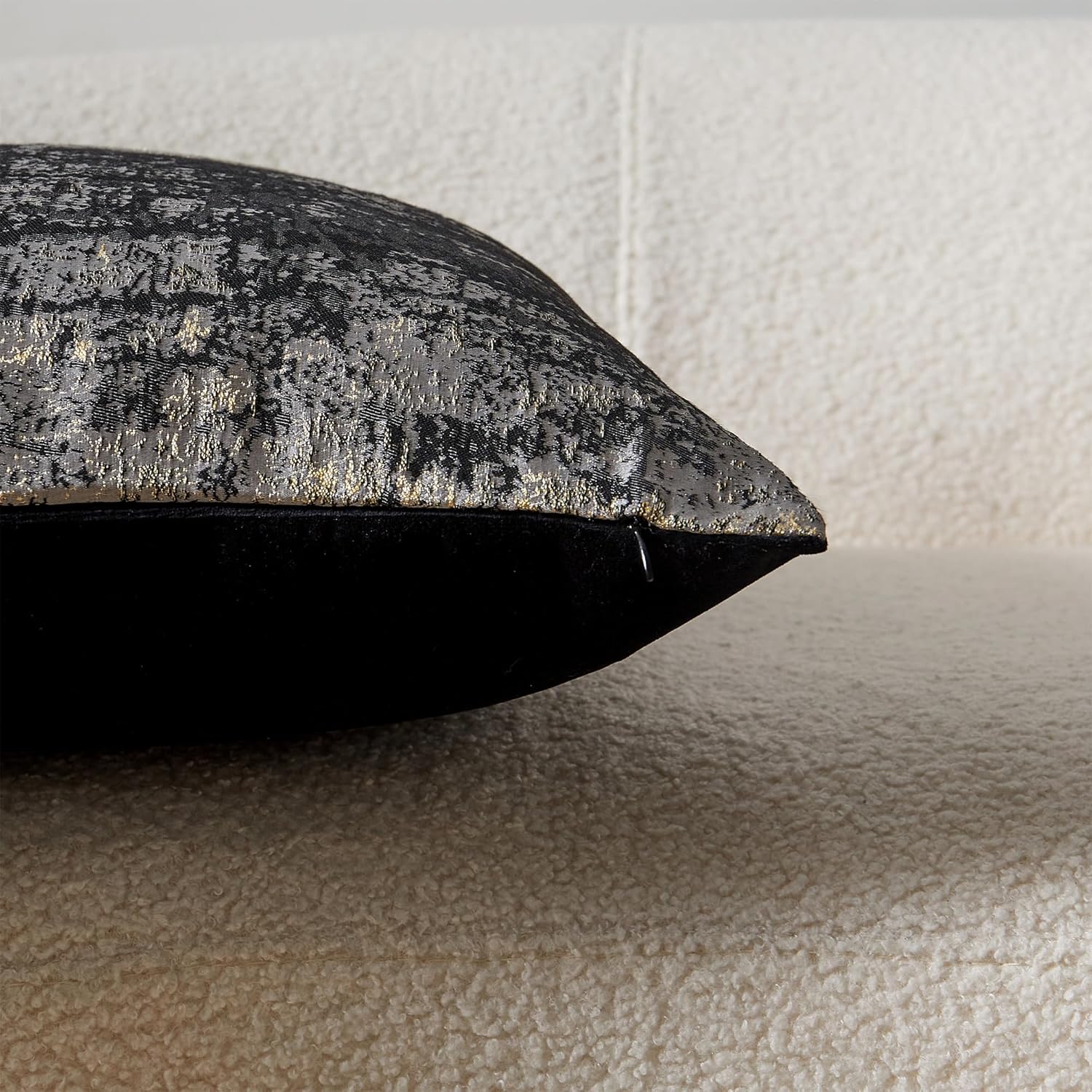 • Premium Jacquard & Velvet Pillow Cover : Crafted with 70% polyester 30% viscose jacquard weave (front) in grey-black with woven gold threads that catch the light, creating a subtle metallic glow. Reverses to 100% polyester black velvet (back) for cloud-like softness. Two looks in one—instantly elevate your sofas, beds, or accent chairs.