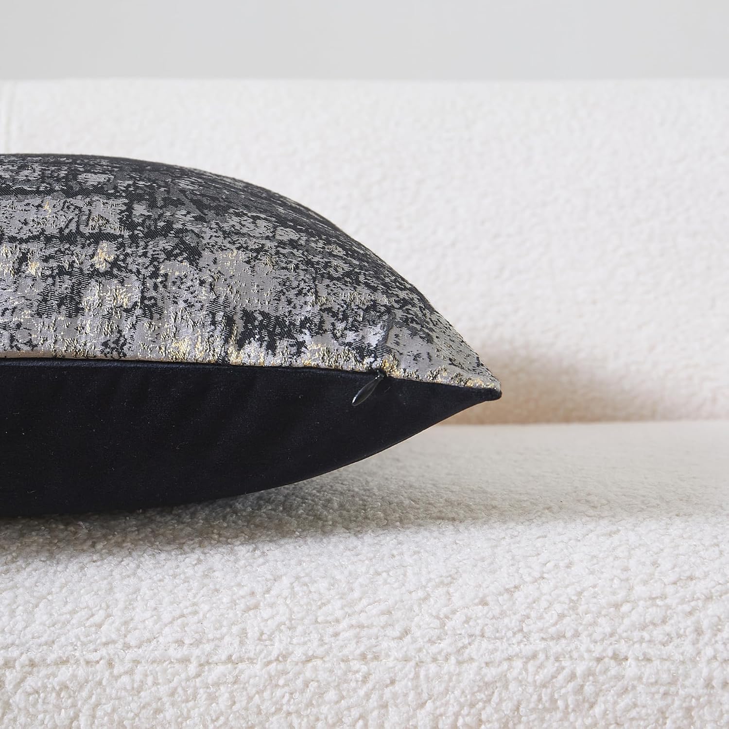 • Premium Jacquard & Velvet Pillow Cover : Crafted with 70% polyester 30% viscose jacquard weave (front) in grey-black with woven gold threads that catch the light, creating a subtle metallic glow. Reverses to 100% polyester black velvet (back) for cloud-like softness. Two looks in one—instantly elevate your sofas, beds, or accent chairs.