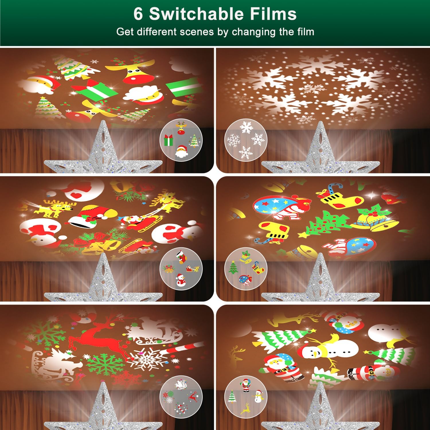 • Magic 3D Rotating Projector: Sliver christmas tree star topper with 3D hollow design, classic pentagram look design with glitter gold powder slight fall of glitter is normal. Decorate the top of your Christmas tree with projected patterns swirling and dancing on the ceiling to make your Christmas impressive