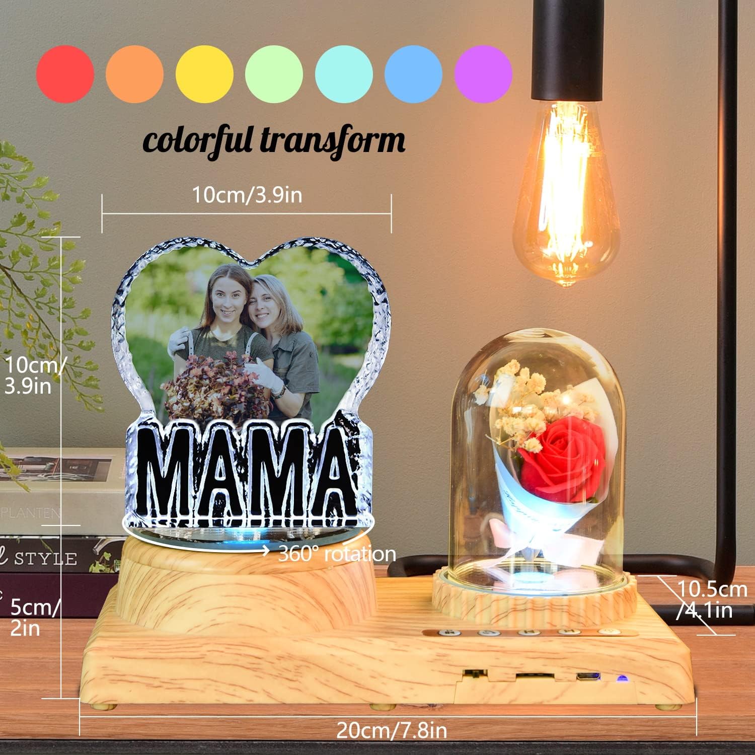• ✔【High Quality Material】This bluetooth crystal ornament adopts high-quality white crystal to customize photos, wood grain rubber bluetooth music base can be connected to bluetooth or insert memory card to play music, with 7 color LED lights to switch freely, 360° rotation, USB charging. It is a very beautiful, romantic and interesting high-quality ornament.