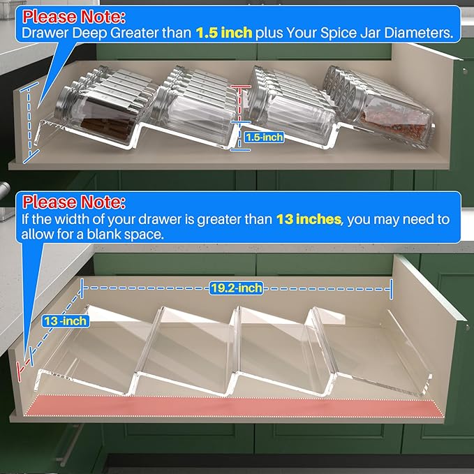 • 【2 mm Thick Food Secure Acrylic】Kitchen Spice Rack Organizers and Storage for Drawer construction with transparent 3 mm acrylic, sturdy and durable. will not yellow or rust like plastic or metal organizers. Use it to organzing spice jars, mini bottled supplement in drawer