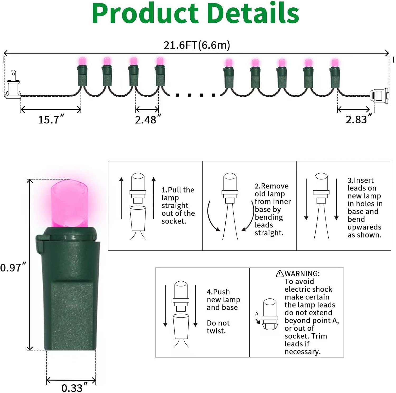 • 5mm LED Christmas Lights: 100 counts warm white 5mm wide angle stable LED string lights spaced 6.3 inches apart with green wire. 7.1 inch leads have a stackable male plug and 5.9 inch tails have a female plug for easy end to end connection.