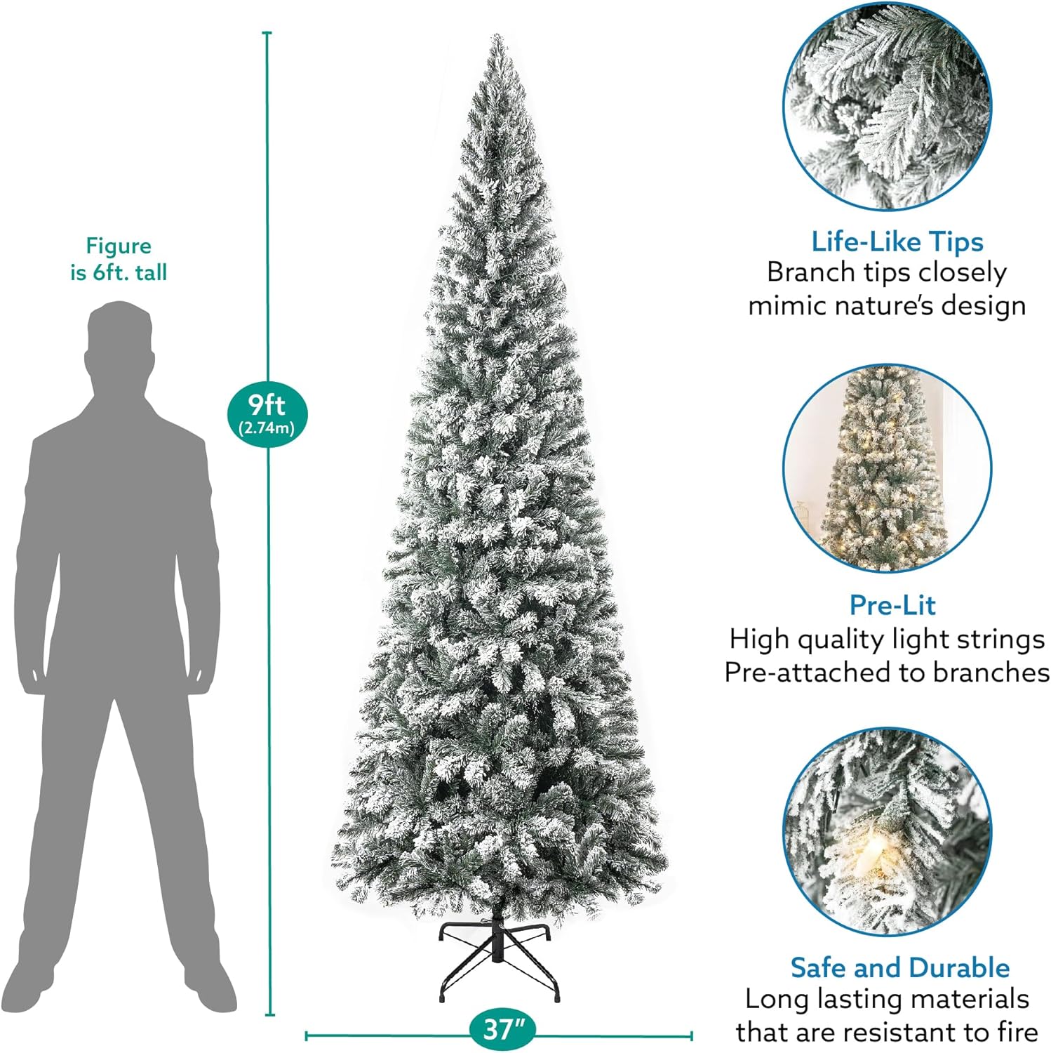 Naomi Home Salzburg 9ft Frosted Prelit Slim Artificial Christmas Tree with 1455 Branch Tips, 500 Warm Lights and Metal Stand, 37" Wide Realistic Snow Flocked Skinny Pencil Christmas Tree