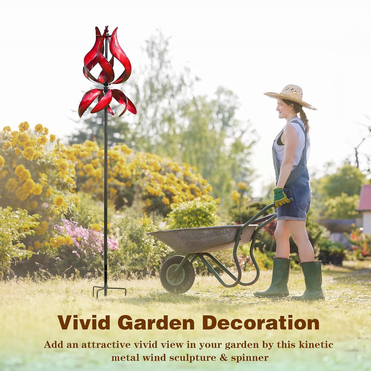 • 【Graceful Burgundy Tulip Wind Spinner】Beautify your outdoor space with this attractive kinetic wind spinner, featuring two layered shinning tulip & leaves. Crafted in painted bright red color, the blades capture and reflect sunlight mesmerizingly and creating attractive movement display. Its timeless rotating design adds vivid motion, transforming your yard into an attractive and peaceful art space.